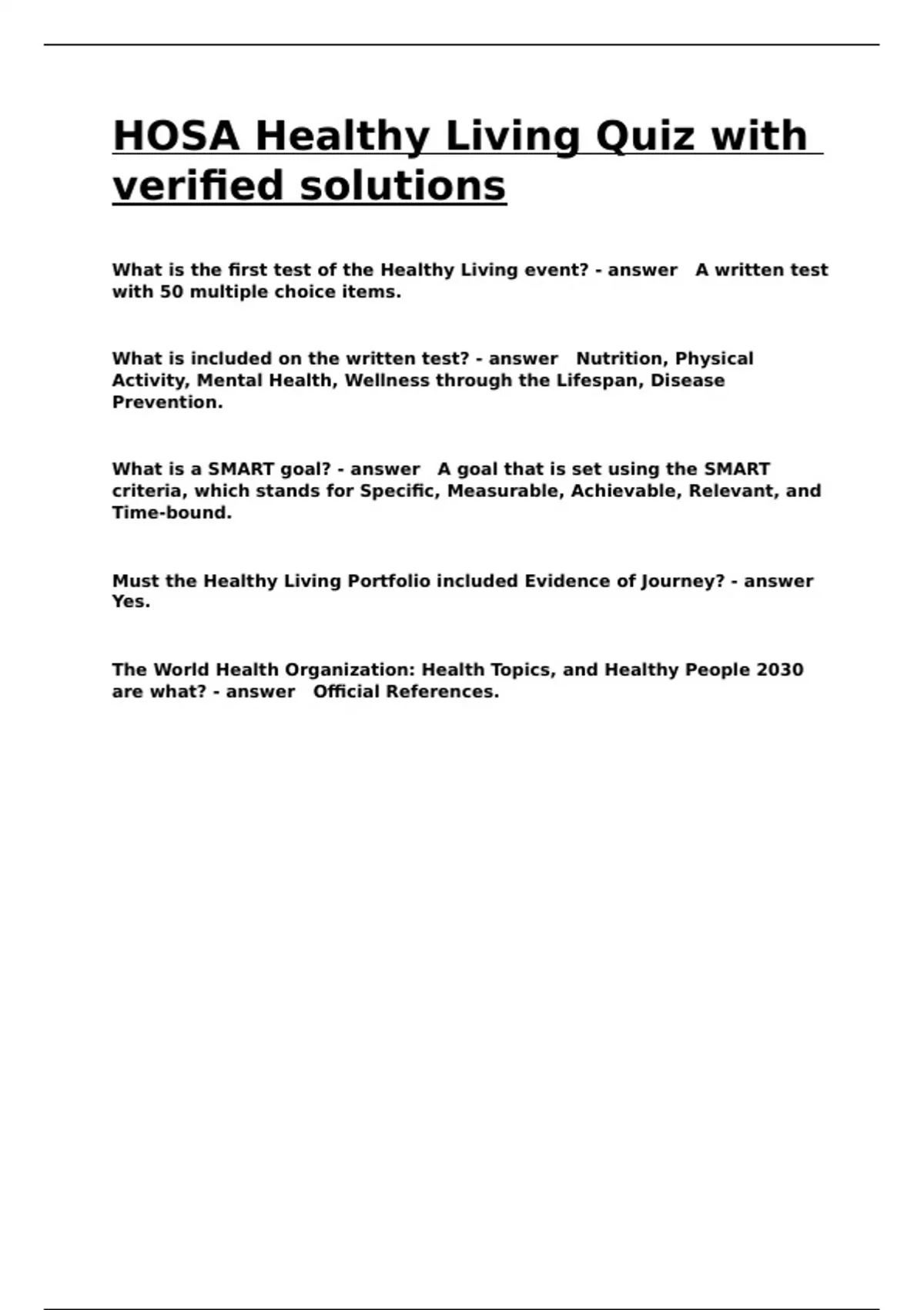 HOSA Healthy Living Quiz with verified solutions