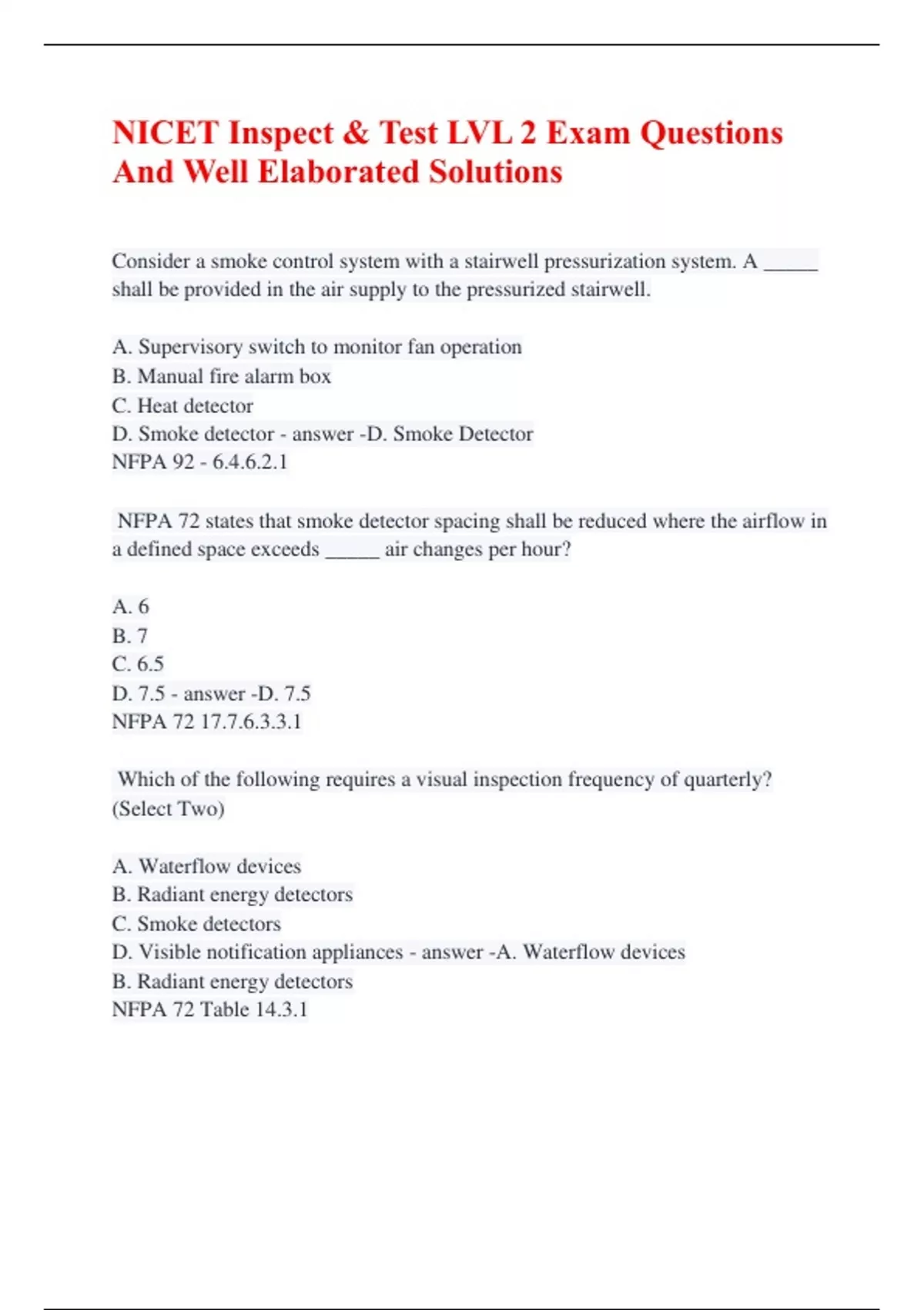 NICET Inspect & Test LVL 2 Exam Questions And Well Elaborated Solutions Consider a smoke control system with a stairwell pressurization system. A _____ shall be provided in the air supply to the pressurized stairwell. A. Supervisory switch to monitor fan operation B. Manual fire alarm box C. Heat detector D. Smoke detector - answer -D. Smoke Detector NFPA 92 - 6.4.6.2.1 NFPA 72 states that smoke detector spacing shall be reduced where the airflow in a defined space exceeds _____ air changes per hour? A. 6 B. 7 C. 6.5 D. 7.5 - answer -D. 7.5 NFPA 72 17.7.6.3.3.1 Which of the following requires a visual inspection frequency of quarterly? (Select Two) A. Waterflow devices B. Radiant energy detectors C. Smoke detectors D. Visible notification appliances - answer -A. Waterflow devices B. Radiant energy detectors NFPA 72 Table 14.3.1 A project in an unsprinklered facility is using CI (circuit integrity) cable to provide a 2-hour fire rated resistance for a circuit. What is the pathway survivability rating? A. Level 1 B. Level 2 C. Level 3 D. Level 4 - answer -B. Level 2 NFPA 72 12.4.3 Consider communications methods for supervising station fire alarm systems. A communication technology which requires annunciation at the supervising station for degradation of the communications channel not to exceed 90 seconds from the time of actual failure is _____? A. Two way radio multiplex systems B. Performance based technology C. DACT systems D. One way private radio systems - answer -A. Two way radio multiplex systems NFPA 72 Table A.26.6.1 Consider an area where the temperature is 120 degrees Fahrenheit. The most appropriate type of smoke detector for this environment is _____? A. Smoke detectors are not appropriate B. Projected beam C. Photoelectric D. Ionization - answer -A. Smoke detectors are not appropriate NFPA 72 A.17.7.1.8 When testing an FSCS, which of the following modes are required to be tested? (Select Two) A. Manual override of normal mode B. Manual override of automatic mode C. Automatic override of normal mode D. Automatic override of alarm mode - answer -A. Manual override of normal mode B. Manual override of automatic mode NFPA 92 - 8.4.7.2 According to NFPA 72, cellular transmission is a performance based technology and as such _____? A. Requires AHJ approval B. Requires the use of a DACT C. Requires a secondary means of transmission D. Does not require a secondary communications path - answer -D. Does not require a secondary communications path NFPA 72 26.6.3.3 Consider the installation of a protected premises fire alarm system. All software and firmware shall be protected against unauthorized access. Access by persons who have are trained and authorized to either repair the control unit or to alter its site specific data or operating system program, thereby changing its basic mode of operation should be considered Access Level _____? A. 4 B. 1 C. 2 D. 3 - answer -A. 4 NFPA 72 A.23.2.2.2 Consider the use of spot type smoke detectors at elevations above 3,000 feet above sea level. This altitude may affect _____ detectors? A. Projected beam B. Photoelectric C. Air sampling D. Ionization - answer -D. Ionization