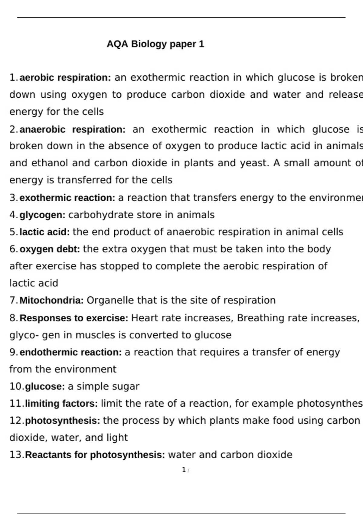 1. aerobic respiration: an exothermic reaction in which glucose is broken