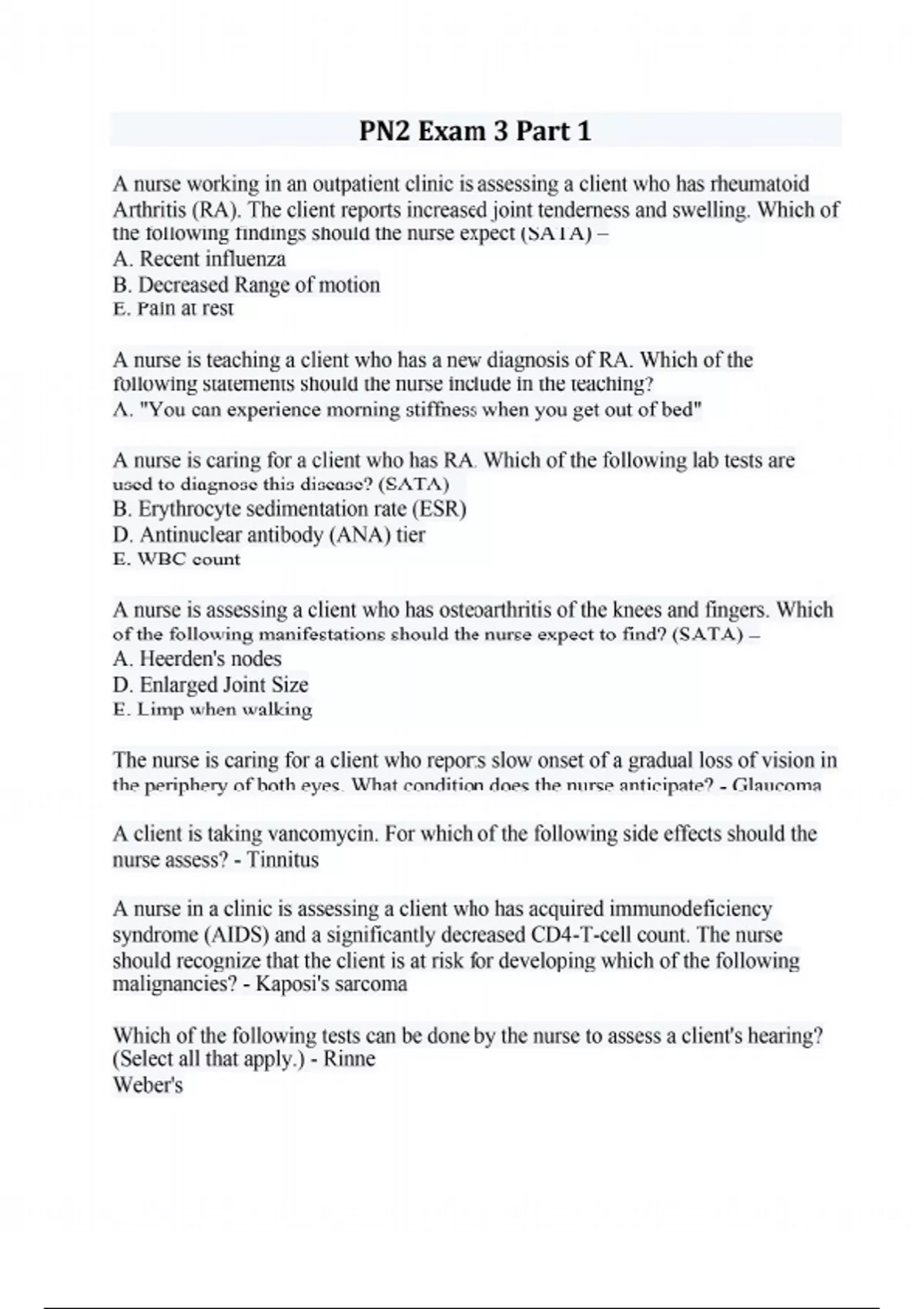 A nurse working in an outpatient clinic is assessing a client who has rheumatoid Arthritis (RA). The client reports increased joint tenderness and swelling. Which of the following findings should the nurse expect (SATA) – A. Recent influenza B. Decreased Range of motion E. Pain at rest A nurse is teaching a client who has a new diagnosis of RA. Which of the following statements should the nurse include in the teaching? A. "You can experience morning stiffness when you get out of bed" A nurse is caring for a client who has RA. Which of the following lab tests are used to diagnose this disease? (SATA) – B. Erythrocyte sedimentation rate (ESR) D. Antinuclear antibody (ANA) tier E. WBC count A nurse is assessing a client who has osteoarthritis of the knees and fingers. Which of the following manifestations should the nurse expect to find? (SATA) – A. Heerden's nodes D. Enlarged Joint Size E. Limp when walking The nurse is caring for a client who reports slow onset of a gradual loss of vision in the periphery of both eyes. What condition does the nurse anticipate? - Glaucoma A client is taking vancomycin. For which of the following side effects should the nurse assess? - Tinnitus A nurse in a clinic is assessing a client who has acquired immunodeficiency syndrome (AIDS) and a significantly decreased CD4-T-cell count. The nurse should recognize that the client is at risk for developing which of the following malignancies? - Kaposi's sarcoma Which of the following tests can be done by the nurse to assess a client's hearing? (Select all that apply.) - Rinne Weber's Cochlear Voice-whisper test The nurse begins to experience red, itchy hands after using gloves for client care. Which of the following should the nurse consider at causing these symptoms? - Latex allergy A client newly diagnosed with type 1 diabetes mellitus wears glasses for myopia and asks the nurse how frequently he should see his ophthalmologist. Which is the nurse's best answer? - "You are at risk for cataracts, glaucoma, and retinal blood vessel changes, so you should see the ophthalmologist yearly, even when you do not have a vision problem." The nurse is preparing short-acting and long-acting insulin for administration to a client. The nurse recognizes the purpose for the client taking these types of insulin is which of the following? - *b. To mimic the body's own insulin patterns The nurse is assessing a client diagnosed with type 1 diabetes mellitus for symptoms associated with diabetic ketoacidosis. Which of the following will the nurse most likely assess in this client? (Select all that apply.) - *b. Fruity breath odor *e. Kussmaul breathing *f. Abdominal discomfort Your patient's blood glucose level is 275 mg/dL. The patient is about to eat breakfast. Per sliding scale, you administer 8 units of Insulin Regular (Humulin R) subcutaneously at 0730. As the nurse, you know the patient is most at risk for hypoglycemia at what time? - 0930 A client is experiencing a loss of central vision but not a loss of peripheral vision. The nurse realizes the client should be evaluated for which of the following disease processes? - Macular degeneration During the assessment of a client with a 15-year history of DM the nurse know that the client has a decreased tactile sensation in both feet which action does the nurse take first? - Examine the clients' feet for signs of injury The nurse is teaching a client how to avoid allergic reactions. Which of the following is not an appropriate recommendation? - "Use corticosteroids daily to prevent reactions" The nurse is providing client education for a client diagnosed with diabetes mellitus. The nurse should incorporate which of the following educational points about delaying the onset of microvascular and macrovascular complications? - Controlling hyperglycemia A Client is diagnosed with rheumatoid arthritis. The nurse would expect to find which of the following during assessment? - Symmetrical Joint involvement The laboratory values of a client who has diabetes mellitus include a fasting blood glucose level of 180 mg/dL and hemoglobin A1C of 6.5%. What is the nurse's interpretations of these findings? - b. The client's glucose control for the past 24 hours has been poor, but the overall control is good. A client's 1200 glucose was inaccurately documented as 310 mg/dL instead of 130 mg/dL. This error was not noticed until 1300. The nurse administered the sliding scale insulin for a blood glucose of 310 mg/dL. What should the nurse do first? - Assess for hypoglycemia The laboratory values of a client with diabetes mellitus include a post meal blood glucose level of 145 mg/dL and hemoglobin A1C of 6.8%. What are the nurse's interpretations of these findings? - The client glucose control for the past 24 hours has been poor, but the overall control is good The nurse is instructing a client diagnosed with type 2 diabetes mellitus on activities to reduce the onset of long-term complications. Which of the following should the nurse include in these instructions? (SATA) - Stop smoking Keep blood pressure under control Attain a normal body weight Increase activity The nurse is preparing a plan of care for a client with diabetes mellitus who has hyperglycemia. The nurse places priority on which client problem? - Inadequate fluid volume A client prescribed insulin to be given through a peripheral intravenous line. The nurse realizes that which of the following insulins can be administered intravenously? - Regular Metformin is prescribed for a client with type 2 diabetes mellitus. What is the most common side effect that the nurse should include in the client's teaching plan? - Gastrointestinal disturbances A nurse is caring for a client who has HIV. Which of the following laboratory values is the nurse's priority? - *a. CD4-T-cell count of less than 180 cells/mm3 A client with diabetes mellitus has a numbness and reduced sensation secondary to sever peripheral neuropathy. The nurse should teach the 
