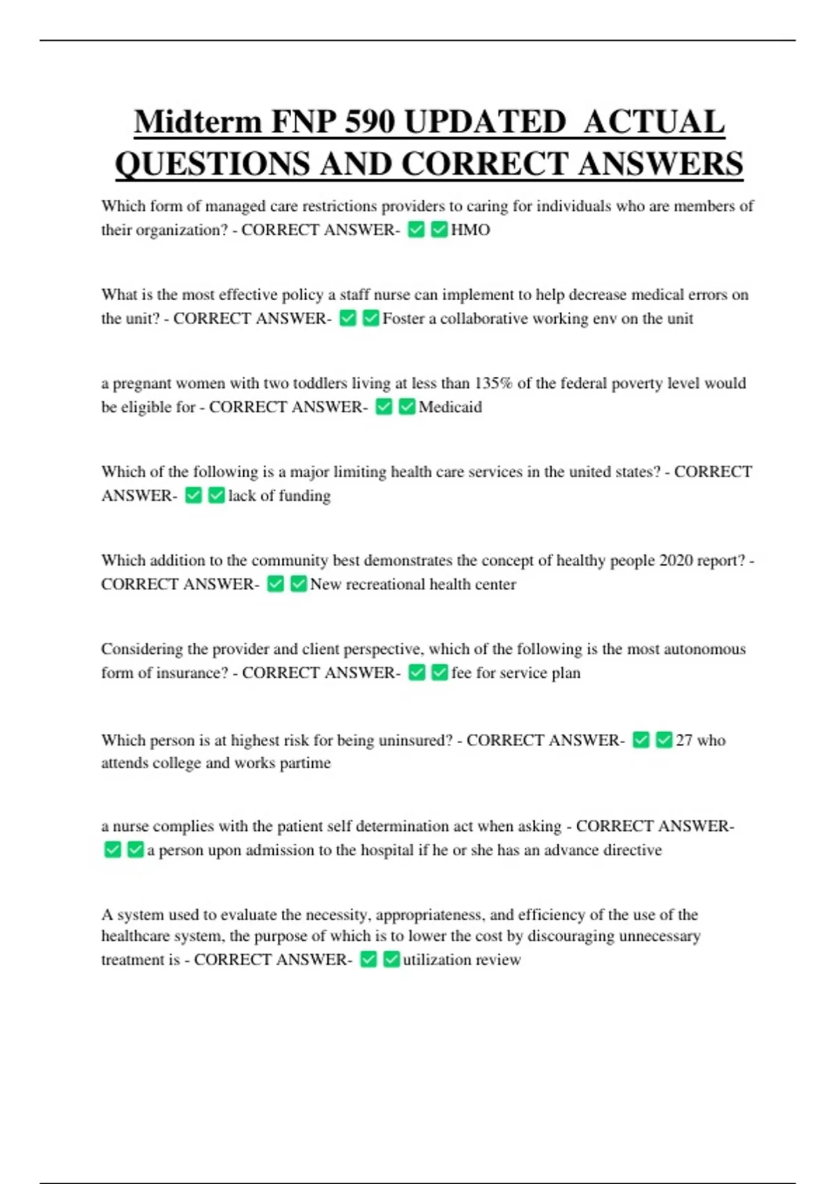 Midterm FNP 590 UPDATED ACTUAL QUESTIONS AND CORRECT ANSWERS Which form of managed care restrictions providers to caring for individuals who are members of their organization? - CORRECT ANSWER- HMO What is the most effective policy a staff nurse can implement to help decrease medical errors on the unit? - CORRECT ANSWER- Foster a collaborative working env on the unit