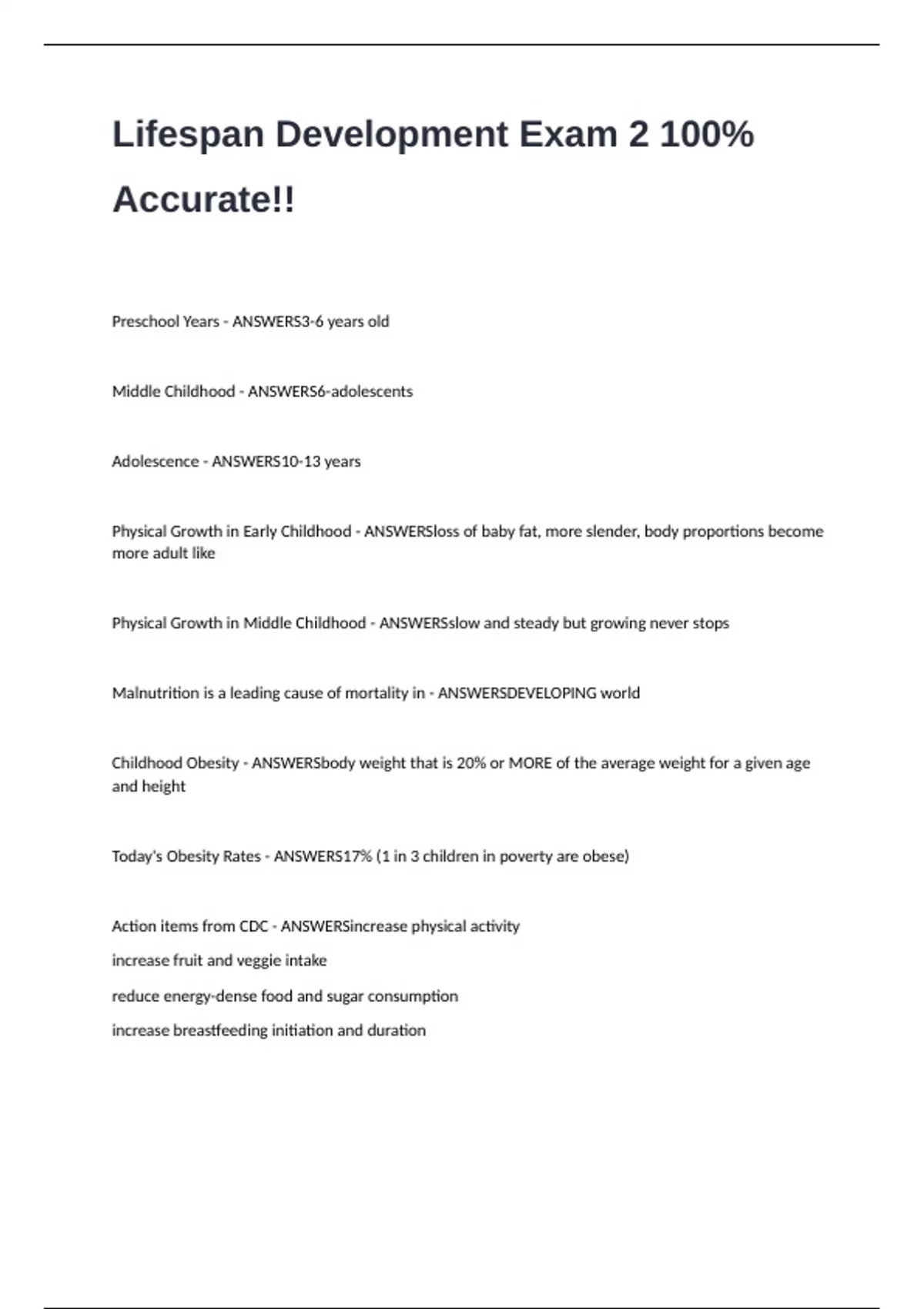 Preschool Years - ANSWERS3-6 years old Middle Childhood - ANSWERS6-adolescents Adolescence - ANSWERS10-13 years Physical Growth in Early Childhood - ANSWERSloss of baby fat, more slender, body proportions become more adult like Physical Growth in Middle Childhood - ANSWERSslow and steady but growing never stops Malnutrition is a leading cause of mortality in - ANSWERSDEVELOPING world Childhood Obesity - ANSWERSbody weight that is 20% or MORE of the average weight for a given age and height Today's Obesity Rates - ANSWERS17% (1 in 3 children in poverty are obese) Action items from CDC - ANSWERSincrease physical activity increase fruit and veggie intake reduce energy-dense food and sugar consumption increase breastfeeding initiation and duration