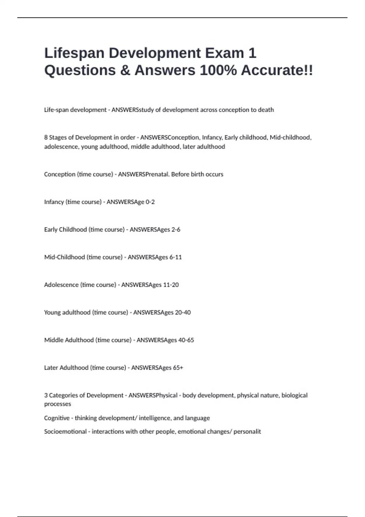 Life-span development - ANSWERSstudy of development across conception to death 8 Stages of Development in order - ANSWERSConception, Infancy, Early childhood, Mid-childhood, adolescence, young adulthood, middle adulthood, later adulthood Conception (time course) - ANSWERSPrenatal. Before birth occurs Infancy (time course) - ANSWERSAge 0-2 Early Childhood (time course) - ANSWERSAges 2-6 Mid-Childhood (time course) - ANSWERSAges 6-11 Adolescence (time course) - ANSWERSAges 11-20 Young adulthood (time course) - ANSWERSAges 20-40 Middle Adulthood (time course) - ANSWERSAges 40-65 Later Adulthood (time course) - ANSWERSAges 65+ 3 Categories of Development - ANSWERSPhysical - body development, physical nature, biological processes Cognitive - thinking development/ intelligence, and language