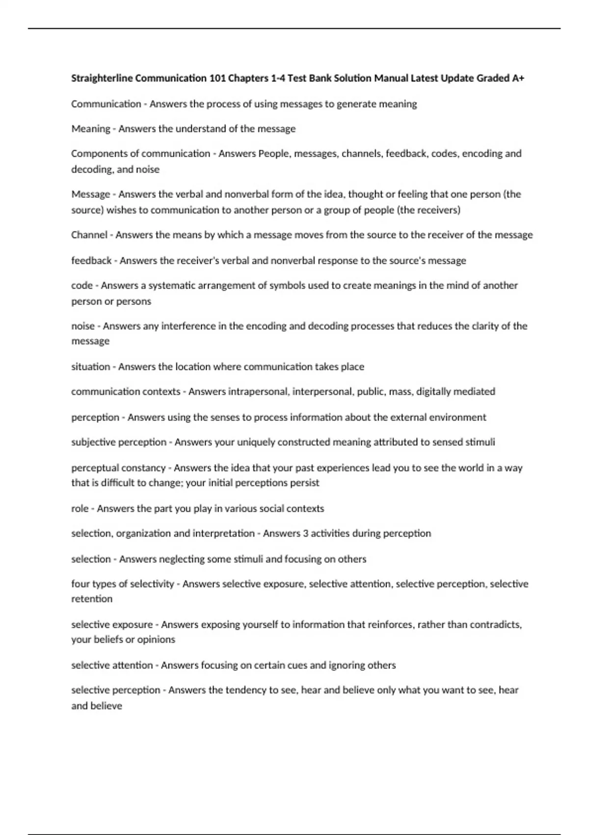 Straighterline Communication 101 Chapters 1-4 Test Bank Solution Manual Latest Update Graded A+ Communication - Answers the process of using messages to generate meaning Meaning - Answers the understand of the message Components of communication - Answers People, messages, channels, feedback, codes, encoding and decoding, and noise Message - Answers the verbal and nonverbal form of the idea, thought or feeling that one person (the source) wishes to communication to another person or a group of people (the receivers) Channel - Answers the means by which a message moves from the source to the receiver of the message feedback - Answers the receiver's verbal and nonverbal response to the source's message code - Answers a systematic arrangement of symbols used to create meanings in the mind of another person or persons noise - Answers any interference in the encoding and decoding processes that reduces the clarity of the message situation - Answers the location where communication takes place communication contexts - Answers intrapersonal, interpersonal, public, mass, digitally mediated perception - Answers using the senses to process information about the external environment subjective perception - Answers your uniquely constructed meaning attributed to sensed stimuli perceptual constancy - Answers the idea that your past experiences lead you to see the world in a way that is difficult to change; your initial perceptions persist role - Answers the part you play in various social contexts selection, organization and interpretation - Answers 3 activities during perception selection - Answers neglecting some stimuli and focusing on others four types of selectivity - Answers selective exposure, selective attention, selective perception, selective retention selective exposure - Answers exposing yourself to information that reinforces, rather than contradicts, your beliefs or opinions selective attention - Answers focusing on certain cues and ignoring others selective perception - Answers the tendency to see, hear and believe only what you want to see, hear and believe selective retention - Answers the tendency to remember better the things that reinforce your beliefs than those that oppose them organization - Answers the grouping of stimuli into meaningful units or wholes figure and ground - Answers the focal point of your attention and the background against which your focused attention occurs closure - Answers the tendency to fill in missing information in order to complete an otherwise incomplete figure or statement proximity - Answers people or objects that are close to each other in time or space are seen as meaningfully related similarity - Answers elements are grouped together because they resemble each other in size, color shape or other attributes interpretation - Answers the assignment of meaning to stimuli stereotyping - Answers occurs when we offer a hasty generalization about a group based on a judgment about an individual from that group prejudice - Answers an unfavorable predisposition about an individual because of their membership in a stereotyped group first impression - Answers an initial opinion about people upon meeting them; may form in as little as three seconds perception checking - Answers a process of describing, interpreting, and verifying that helps us understand another person and his or her message more accurately intrapersonal communication - Answers communication with oneself Symbolic Interactionism - Answers the process of development of the self through the messages and feedback received from others self-presentation - Answers the way we portray ourselves to others impression management - Answers sharing personal details in order to present an idealized self manner - Answers both verbal and nonverbal codes appearance - Answers may suggest a role you are playing, a value you hold, your personality or