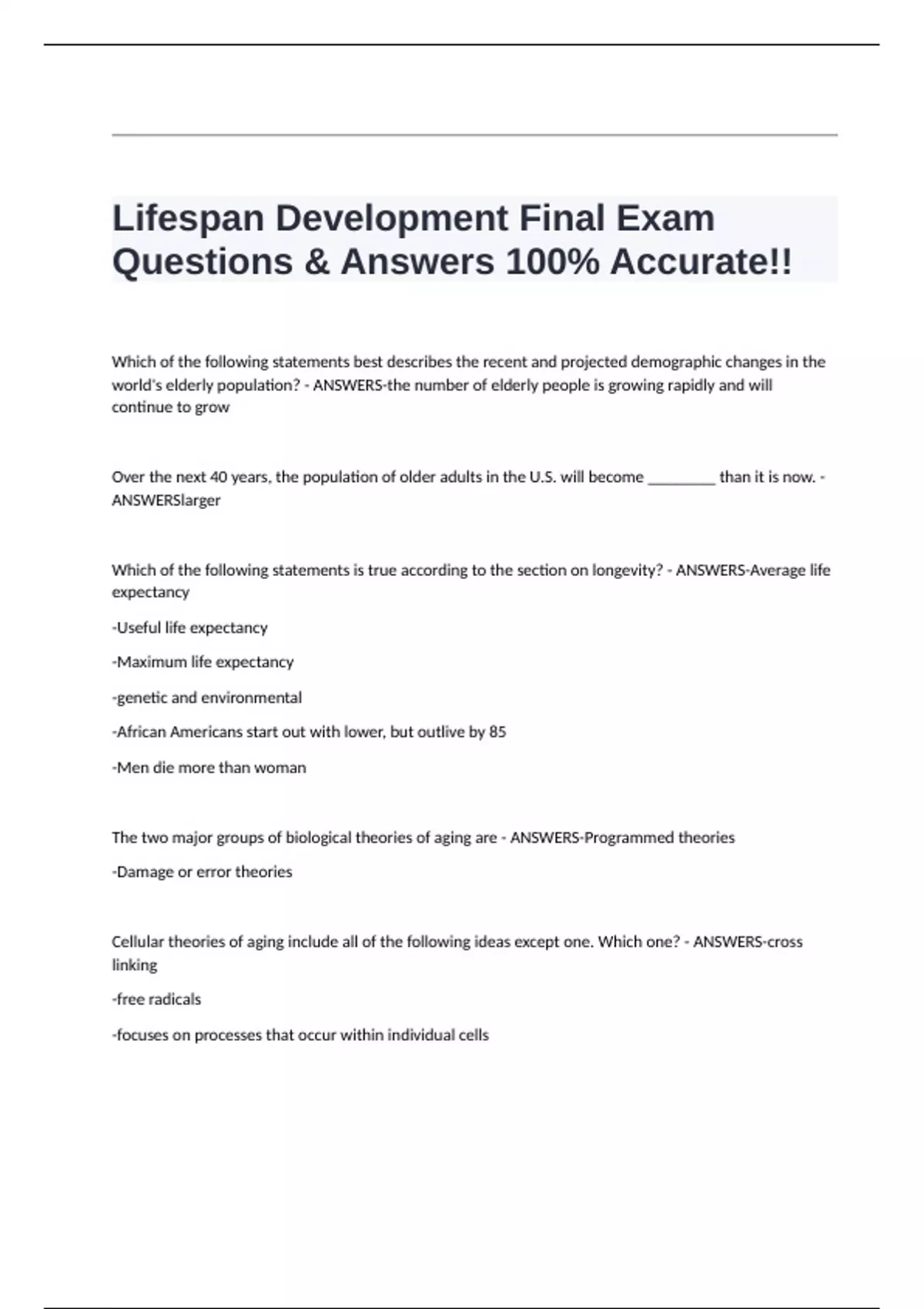 Which of the following statements best describes the recent and projected demographic changes in the world's elderly population? - ANSWERS-the number of elderly people is growing rapidly and will continue to grow Over the next 40 years, the population of older adults in the U.S. will become ________ than it is now. - ANSWERSlarger Which of the following statements is true according to the section on longevity? - ANSWERS-Average life expectancy -Useful life expectancy -Maximum life expectancy -genetic and environmental -African Americans start out with lower, but outlive by 85 -Men die more than woman The two major groups of biological theories of aging are - ANSWERS-Programmed theories -Damage or error theories Cellular theories of aging include all of the following ideas except one. Which one? - ANSWERS-cross linking -free radicals