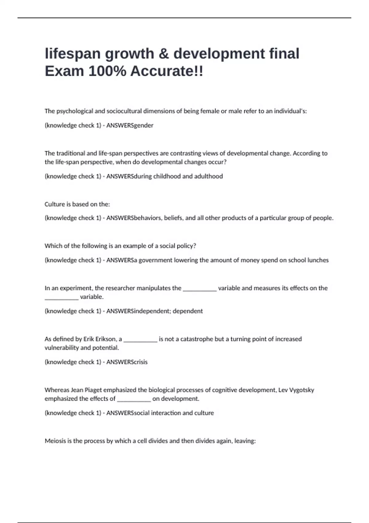 The psychological and sociocultural dimensions of being female or male refer to an individual's: (knowledge check 1) - ANSWERSgender The traditional and life-span perspectives are contrasting views of developmental change. According to the life-span perspective, when do developmental changes occur? (knowledge check 1) - ANSWERSduring childhood and adulthood Culture is based on the: (knowledge check 1) - ANSWERSbehaviors, beliefs, and all other products of a particular group of people. Which of the following is an example of a social policy? (knowledge check 1) - ANSWERSa government lowering the amount of money spend on school lunches In an experiment, the researcher manipulates the __________ variable and measures its effects on the __________ variable. (knowledge check 1) - ANSWERSindependent; dependent As defined by Erik Erikson, a __________ is not a catastrophe but a turning point of increased vulnerability and potential. (knowledge check 1) - ANSWERScrisis Whereas Jean Piaget emphasized the biological processes of cognitive development, Lev Vygotsky emphasized the effects of __________ on development. (knowledge check 1) - ANSWERSsocial interaction and culture Meiosis is the process by which a cell divides and then divides again, leaving: