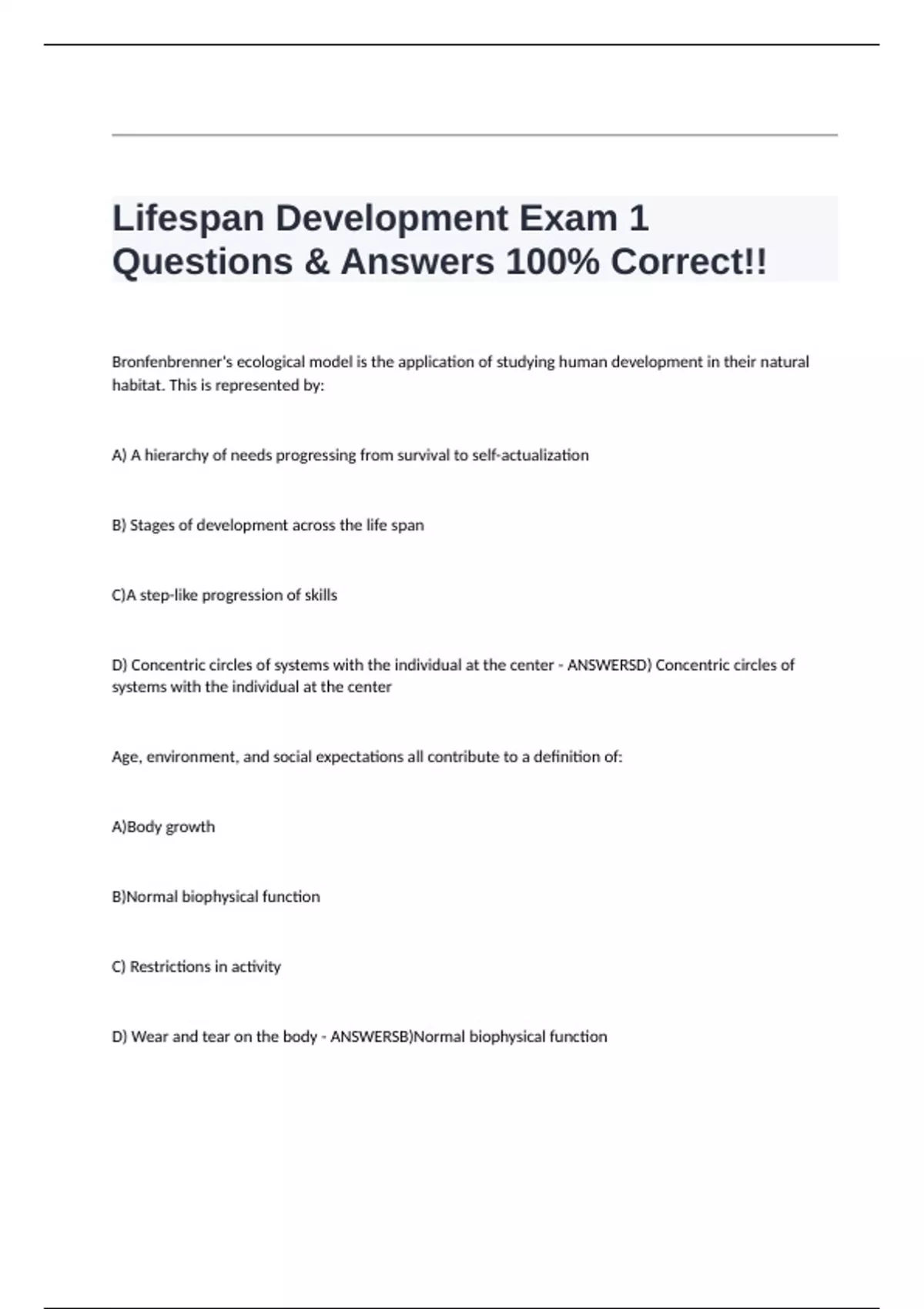 Lifespan Development Exam 1 Questions & Answers 100% Correct!!