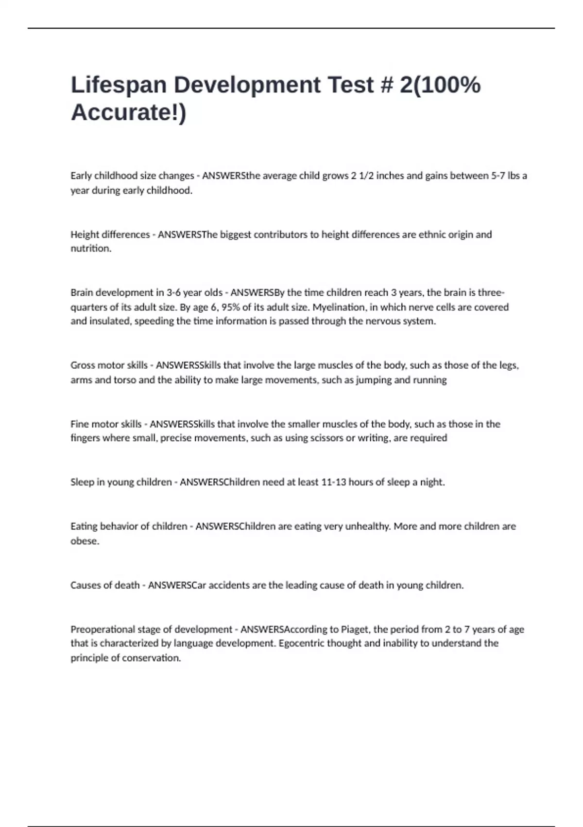 Early childhood size changes - ANSWERSthe average child grows 2 1/2 inches and gains between 5-7 lbs a year during early childhood. Height differences - ANSWERSThe biggest contributors to height differences are ethnic origin and nutrition. Brain development in 3-6 year olds - ANSWERSBy the time children reach 3 years, the brain is three-quarters of its adult size. By age 6, 95% of its adult size. Myelination, in which nerve cells are covered and insulated, speeding the time information is passed through the nervous system. Gross motor skills - ANSWERSSkills that involve the large muscles of the body, such as those of the legs, arms and torso and the ability to make large movements, such as jumping and running Fine motor skills - ANSWERSSkills that involve the smaller muscles of the body, such as those in the fingers where small, precise movements, such as using scissors or writing, are required Sleep in young children - ANSWERSChildren need at least 11-13 hours of sleep a night. Eating behavior of children - ANSWERSChildren are eating very unhealthy. More and more children are obese. Causes of death - ANSWERSCar accidents are the leading cause of death in young children. Preoperational stage of development - ANSWERSAccording to Piaget, the period from 2 to 7 years of age that is characterized by language development. Egocentric thought and inability to understand the principle of conservation.