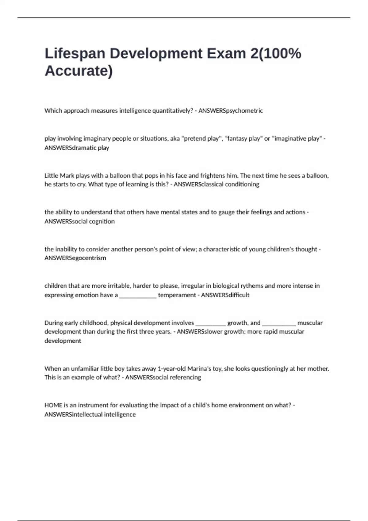 Which approach measures intelligence quantitatively? - ANSWERSpsychometric play involving imaginary people or situations, aka "pretend play", "fantasy play" or "imaginative play" - ANSWERSdramatic play Little Mark plays with a balloon that pops in his face and frightens him. The next time he sees a balloon, he starts to cry. What type of learning is this? - ANSWERSclassical conditioning the ability to understand that others have mental states and to gauge their feelings and actions - ANSWERSsocial cognition the inability to consider another person's point of view; a characteristic of young children's thought - ANSWERSegocentrism children that are more irritable, harder to please, irregular in biological rythems and more intense in expressing emotion have a ___________ temperament - ANSWERSdifficult During early childhood, physical development involves _________ growth, and __________ muscular development than during the first three years. - ANSWERSslower growth; more rapid muscular development When an unfamiliar little boy takes away 1-year-old Marina's toy, she looks questioningly at her mother. This is an example of what? - ANSWERSsocial referencing HOME is an instrument for evaluating the impact of a child's home environment on what? - ANSWERSintellectual intelligence