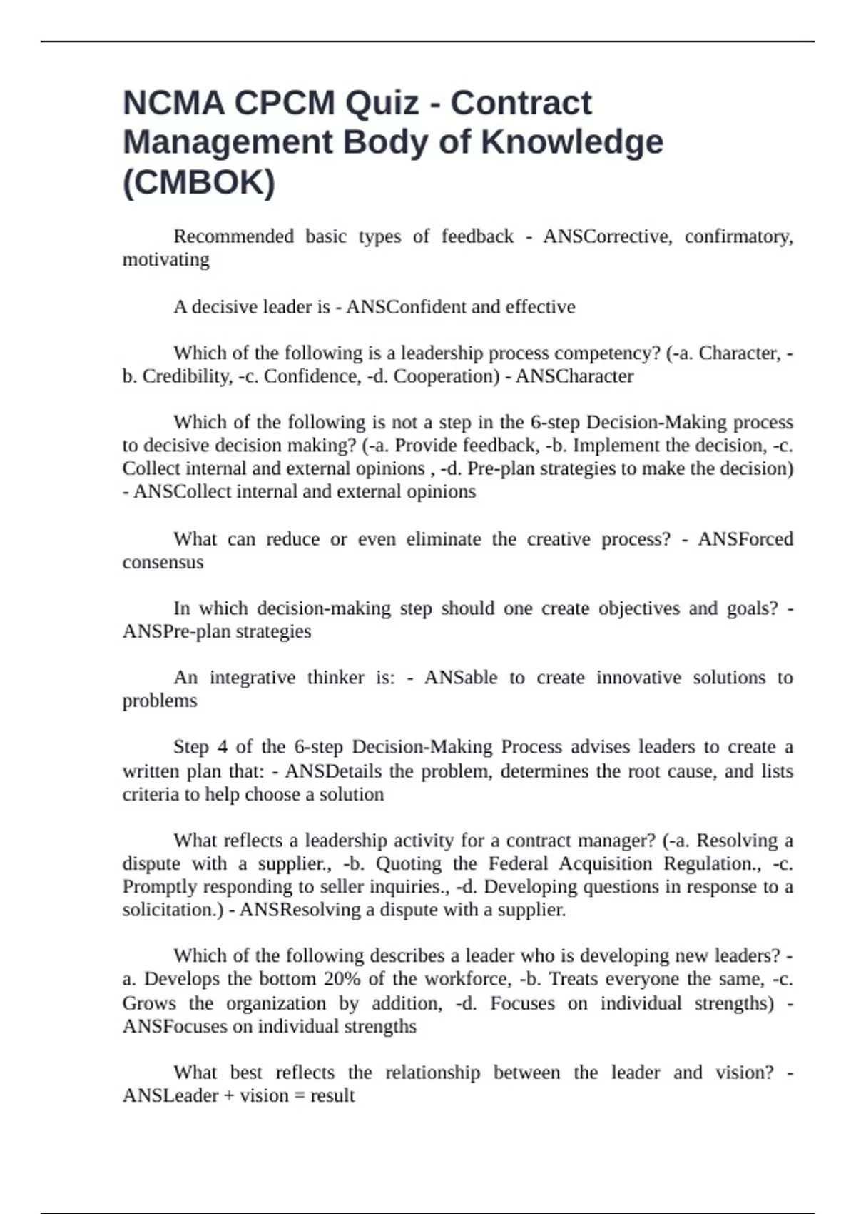 NCMA CPCM Quiz - Contract Management Body of Knowledge (CMBOK)