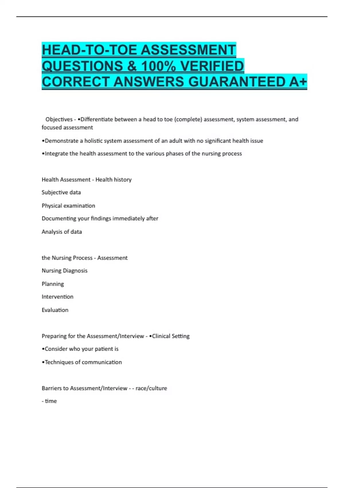 k Objectives - •Differentiate between a head to toe (complete) assessment, system assessment, and