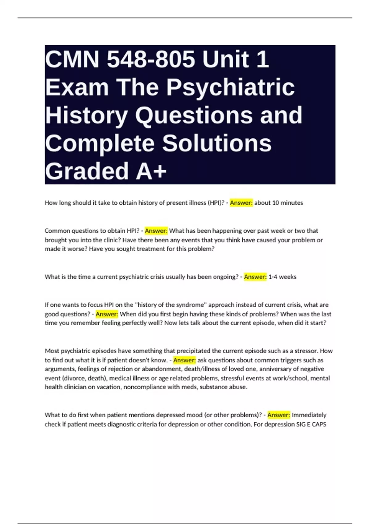 CMN 548-805 Unit 1 Exam The Psychiatric History Questions and Complete Solutions Graded A+
