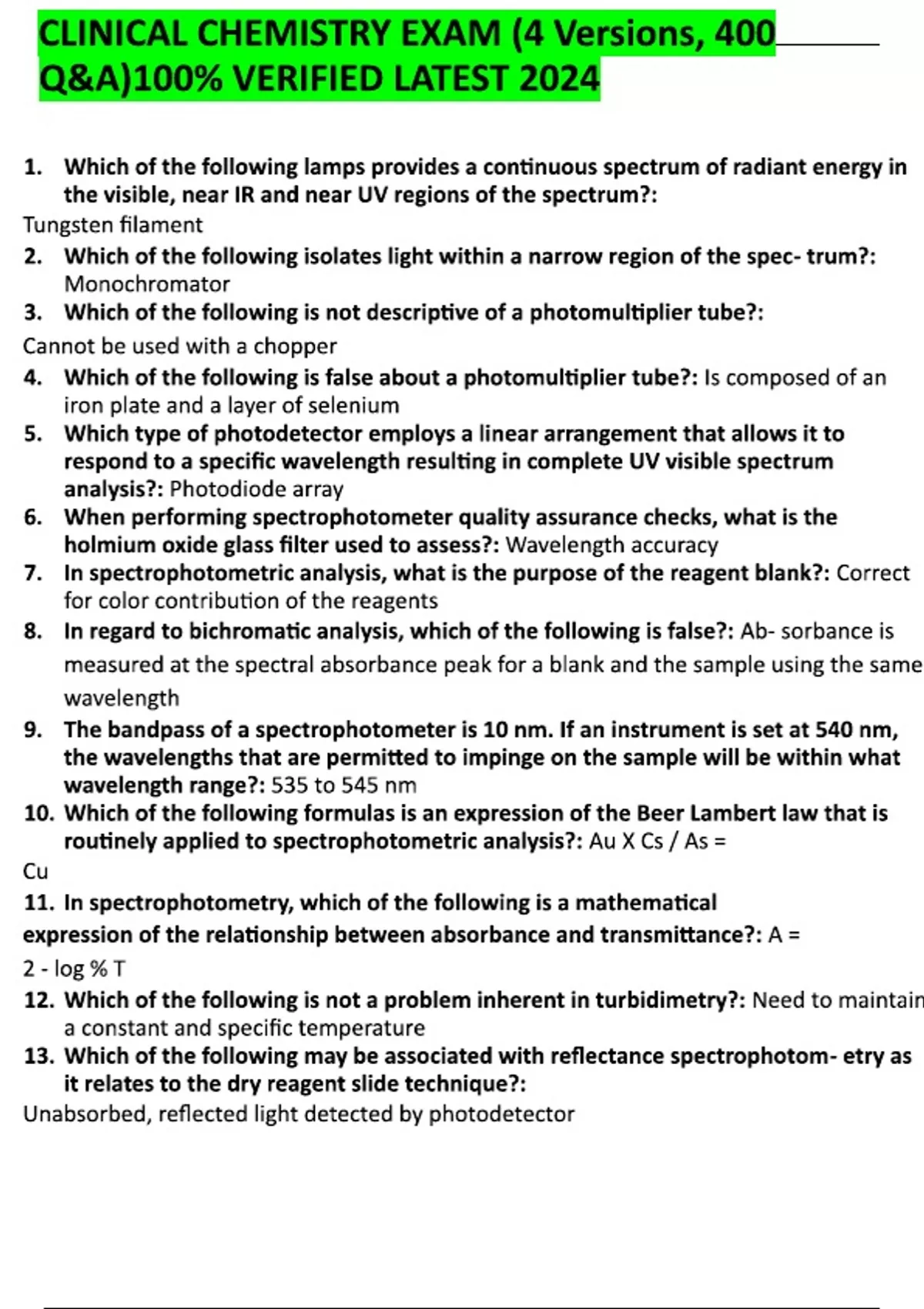 CLINICAL CHEMISTRY EXAM (4 Versions, 400 Q_A)100 VERIFIED LATEST 2024