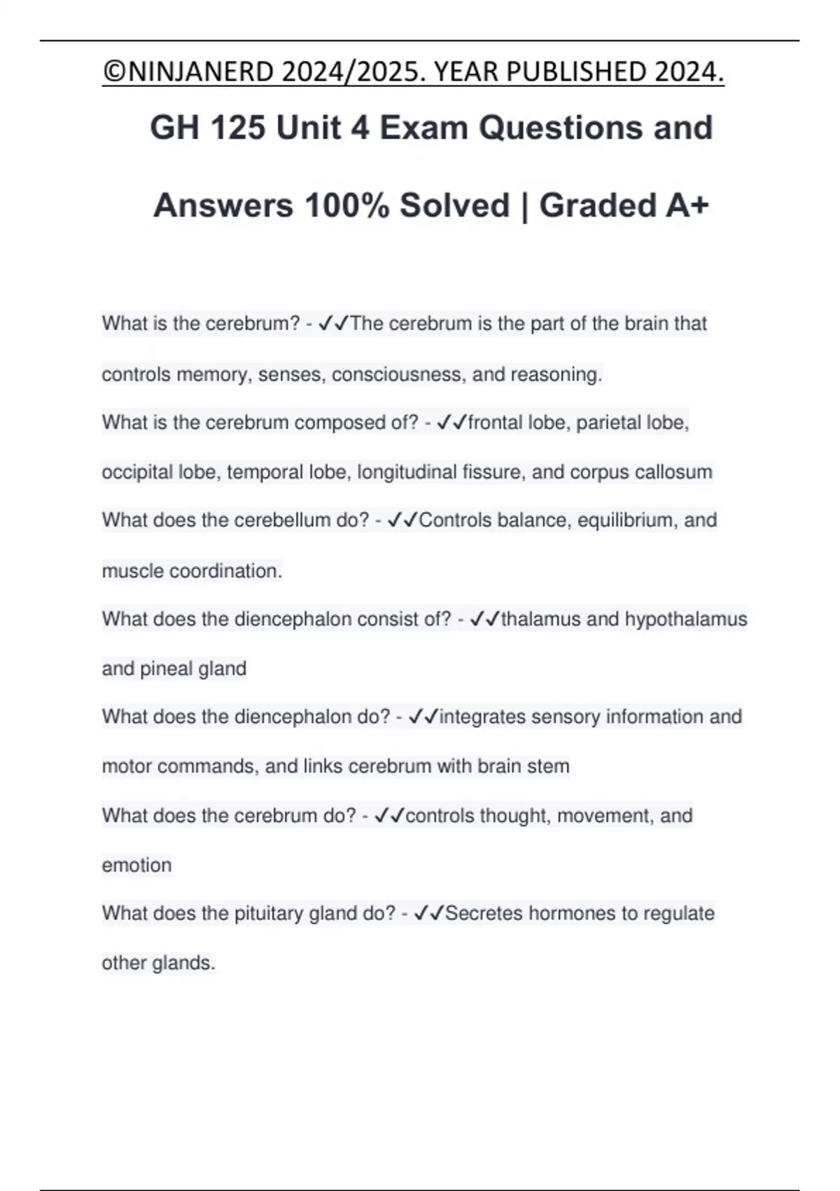 GH 125 Unit 4 Exam Questions and Answers 100% Solved | Graded A+ What is the cerebrum? - The cerebrum is the part of the brain that controls memory, senses, consciousness, and reasoning. What is the cerebrum composed of? - frontal lobe, parietal lobe, occipital lobe, temporal lobe, longitudinal fissure, and corpus callosum What does the cerebellum do? - Controls balance, equilibrium, and muscle coordination. What does the diencephalon consist of? - thalamus and hypothalamus and pineal gland What does the diencephalon do? - integrates sensory information and motor commands, and links cerebrum with brain stem What does the cerebrum do? - controls thought, movement, and emotion What does the pituitary gland do? - Secretes hormones to regulate other glands.