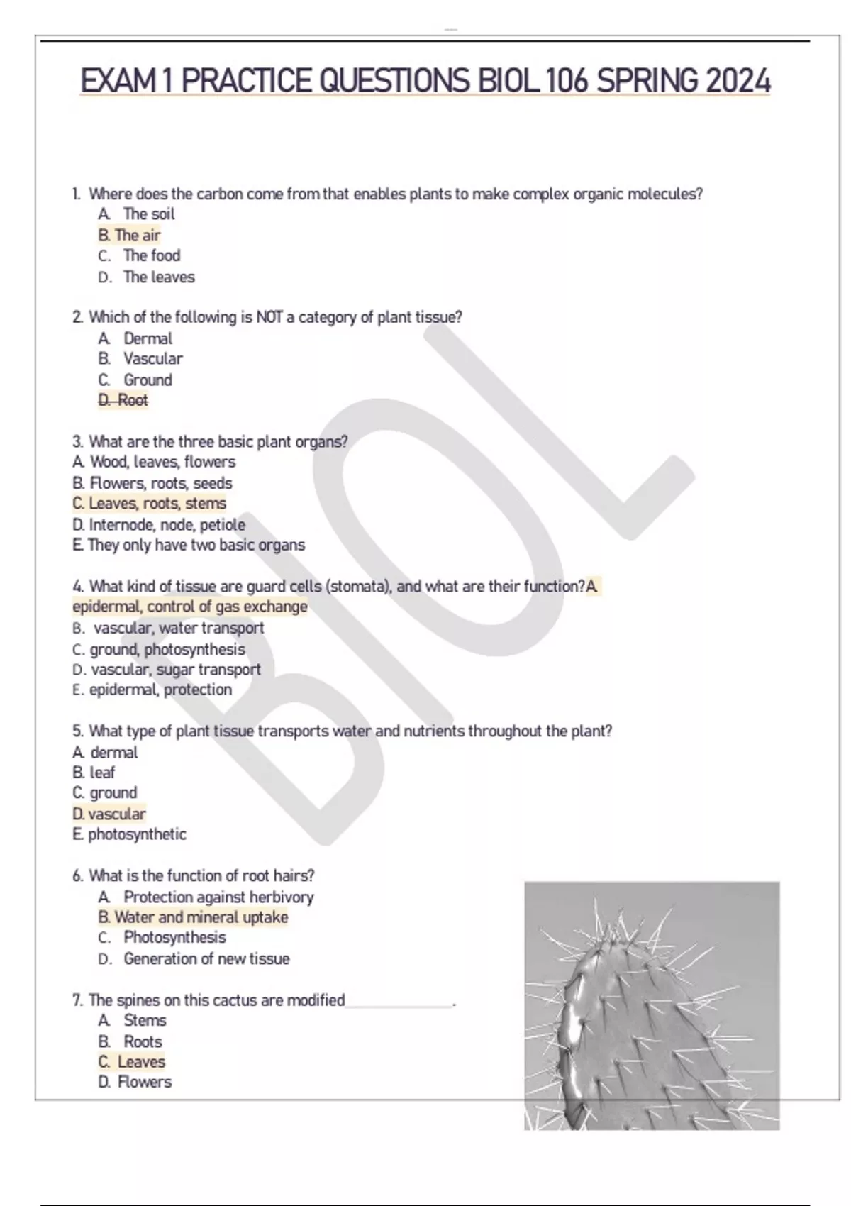 EXAM 1 PRACTICE QUESTIONS BIOL 106 SPRING 2024