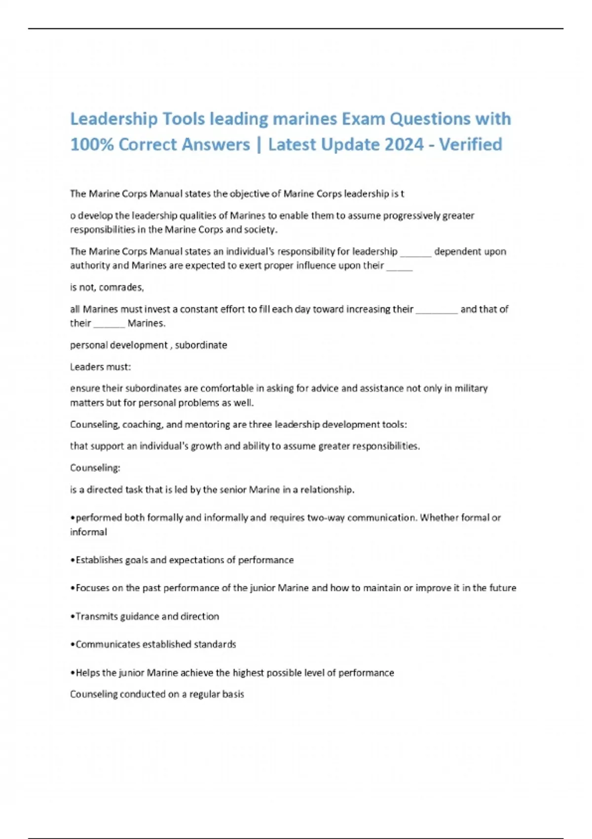 Leadership Tools leading marines Exam Questions with 100% Correct Answers | Latest Update 2024 - Verified The Marine Corps Manual states the objective of Marine Corps leadership is t o develop the leadership qualities of Marines to enable them to assume progressively greater responsibilities in the Marine Corps and society. The Marine Corps Manual states an individual's responsibility for leadership ______ dependent upon authority and Marines are expected to exert proper influence upon their _____ is not, comrades, all Marines must invest a constant effort to fill each day toward increasing their ________ and that of their ______ Marines. personal development , subordinate Leaders must: ensure their subordinates are comfortable in asking for advice and assistance not only in military matters but for personal problems as well. Counseling, coaching, and mentoring are three leadership development tools: that support an individual's growth and ability to assume greater responsibilities. Counseling: is a directed task that is led by the senior Marine in a relationship. •performed both formally and informally and requires two-way communication. Whether formal or informal •Establishes goals and expectations of performance •Focuses on the past performance of the junior Marine and how to maintain or improve it in the future •Transmits guidance and direction •Communicates established standards •Helps the junior Marine achieve the highest possible level of performance Counseling conducted on a regular basis