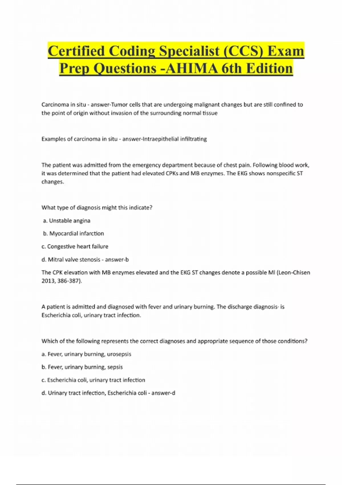Certified Coding Specialist (CCS) Exam Prep Questions -AHIMA 6th Edition Carcinoma in situ - answer-Tumor cells that are undergoing malignant changes but are still confined to the point of origin without invasion of the surrounding normal tissue Examples of carcinoma in situ - answer-Intraepithelial infiltrating The patient was admitted from the emergency department because of chest pain. Following blood work, it was determined that the patient had elevated CPKs and MB enzymes. The EKG shows nonspecific ST changes. What type of diagnosis might this indicate? a. Unstable angina b. Myocardial infarction c. Congestive heart failure d. Mitral valve stenosis - answer-b The CPK elevation with MB enzymes elevated and the EKG ST changes denote a possible Ml (Leon-Chisen 2013, 386-387). A patient is admitted and diagnosed with fever and urinary burning. The discharge diagnosis· is Escherichia coli, urinary tract infection. Which of the following represents the correct diagnoses and appropriate sequence of those conditions? a. Fever, urinary burning, urosepsis b. Fever, urinary burning, sepsis c. Escherichia coli, urinary tract infection d. Urinary tract infection, Escherichia coli - answer-d