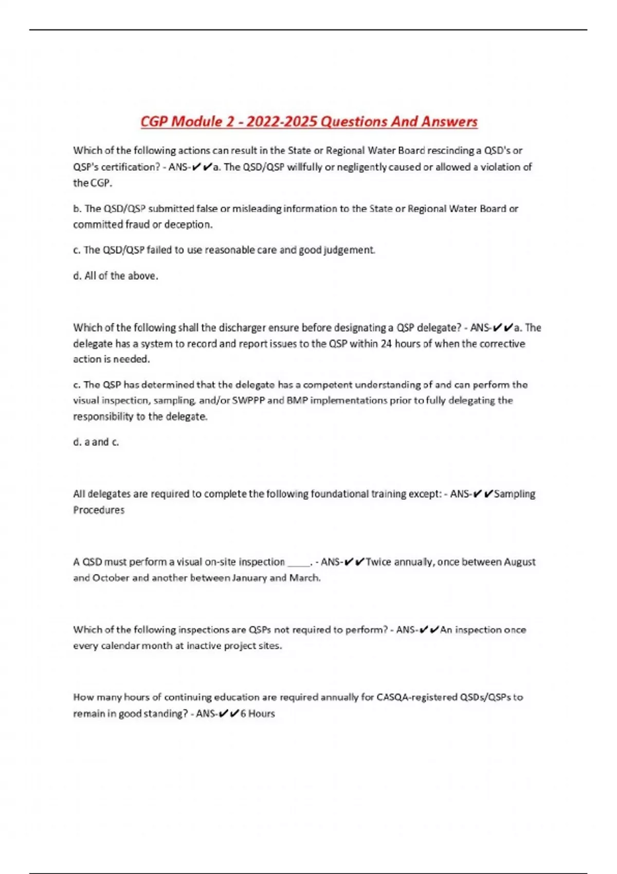 CGP Module Questions And Answers Which of the following actions can result in the State or Regional Water Board rescinding a QSD's or QSP's certification? - ANS-a. The QSD/QSP willfully or negligently caused or allowed a violation of the CGP. b. The QSD/QSP submitted false or misleading information to the State or Regional Water Board or committed fraud or deception. c. The QSD/QSP failed to use reasonable care and good judgement. d. All of the above. Which of the following shall the discharger ensure before designating a QSP delegate? - ANS-a. The delegate has a system to record and report issues to the QSP within 24 hours of when the corrective action is needed. c. The QSP has determined that the delegate has a competent understanding of and can perform the visual inspection, sampling, and/or SWPPP and BMP implementations prior to fully delegating the responsibility to the delegate. d. a and c. All delegates are required to complete the following foundational training except: - ANS-Sampling Procedures A QSD must perform a visual on-site inspection ____. - ANS-Twice annually, once between August and October and another between January and March. Which of the following inspections are QSPs not required to perform? - ANS-An inspection once every calendar month at inactive project sites. How many hours of continuing education are required annually for CASQA-registered QSDs/QSPs to remain in good standing? - ANS....
