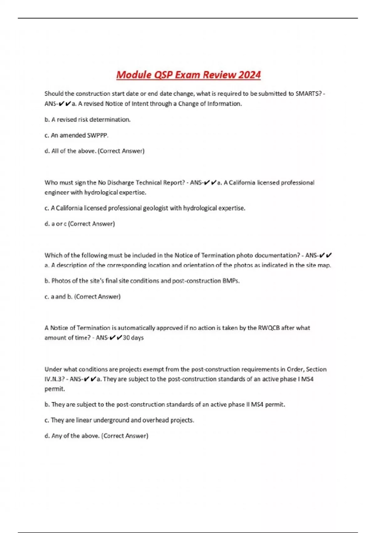 Module QSP Exam Review 2024 Should the construction start date or end date change, what is required to be submitted to SMARTS? - ANS-a. A revised Notice of Intent through a Change of Information. b. A revised risk determination. c. An amended SWPPP. d. All of the above. (Correct Answer) Who must sign the No Discharge Technical Report? - ANS-a. A California licensed professional engineer with hydrological expertise. c. A California licensed professional geologist with hydrological expertise. d. a or c (Correct Answer) Which of the following must be included in the Notice of Termination photo documentation? - ANS- a. A description of the corresponding location and orientation of the photos as indicated in the site map. b. Photos of the site's final site conditions and post-construction BMPs. c. a and b. (Correct Answer) A Notice of Termination is automatically approved if no action is taken by the RWQCB after what amount of time? - ANS-30 days Under what conditions are projects exempt from the post-construction requirements in Order, Section IV.N.3? - ANS-a. They are subject to the post-construction standards of an active phase I MS4 permit. b. They are subject to the post-construction standards of an active phase II MS4 permit. c. They are linear underground and overhead projects. d. Any of the above. (Correct Answer