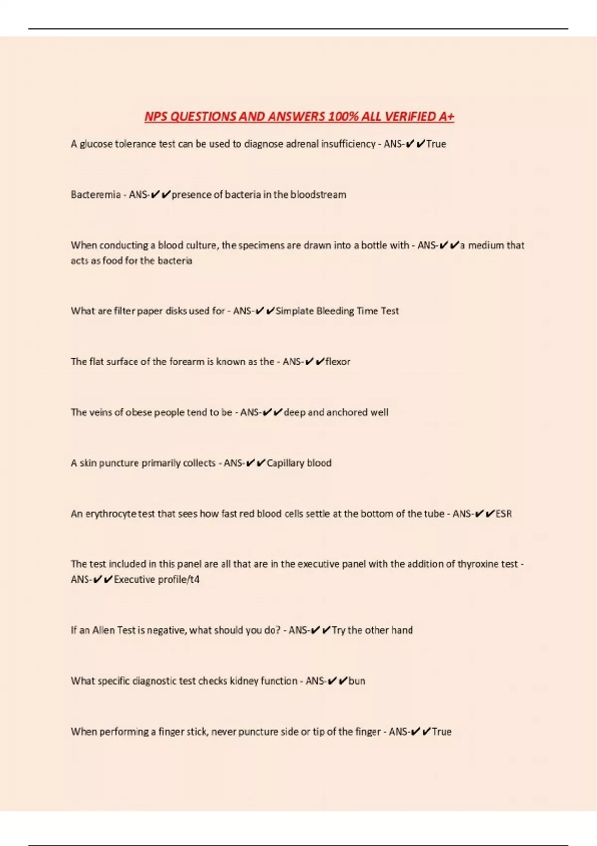 NPS QUESTIONS AND ANSWERS 100% ALL VERIFIED A+ A glucose tolerance test can be used to diagnose adrenal insufficiency - ANS-True Bacteremia - ANS-presence of bacteria in the bloodstream When conducting a blood culture, the specimens are drawn into a bottle with - ANS-a medium that acts as food for the bacteria What are filter paper disks used for - ANS-Simplate Bleeding Time Test The flat surface of the forearm is known as the - ANS-flexor The veins of obese people tend to be - ANS-deep and anchored well A skin puncture primarily collects - ANS-Capillary blood An erythrocyte test that sees how fast red blood cells settle at the bottom of the tube - ANS-ESR The test included in this panel are all that are in the executive panel with the addition of thyroxine test - ANS-Executive profile/t4 If an Allen Test is negative, what should you do? - ANS-Try the other hand What specific diagnostic test checks kidney function - ANS...