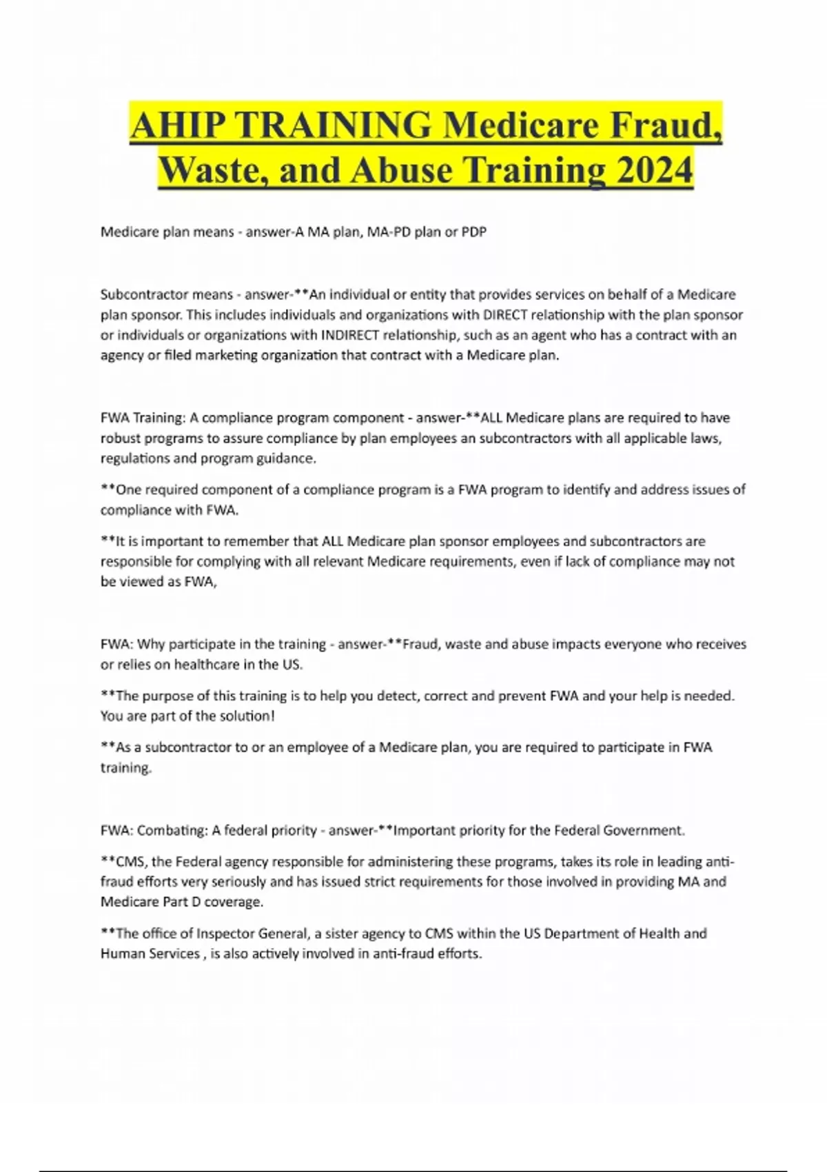 AHIP TRAINING Medicare Fraud, Waste, and Abuse Training 2024 Medicare plan means - answer-A MA plan, MA-PD plan or PDP Subcontractor means - answer-**An individual or entity that provides services on behalf of a Medicare plan sponsor. This includes individuals and organizations with DIRECT relationship with the plan sponsor or individuals or organizations with INDIRECT relationship, such as an agent who has a contract with an agency or filed marketing organization that contract with a Medicare plan. FWA Training: A compliance program component - answer-**ALL Medicare plans are required to have robust programs to assure compliance by plan employees an subcontractors with all applicable laws, regulations and program guidance. **One required component of a compliance program is a FWA program to identify and address issues of compliance with FWA. **It is important to remember that ALL Medicare plan sponsor employees and subcontractors are responsible for complying with all relevant Medicare requirements, even if lack of compliance may not be viewed as FWA, FWA: Why participate in the training - answer-**Fraud, waste and abuse impacts everyone who receives or relies on healthcare in the US. **The purpose of this training is to help you detect, correct and prevent FWA and your help is needed. You are part of the solution! **As a subcontractor to or an employee of a Medicare plan, you are required to participate in FWA training. FWA: Combating: A federal priority - answer-**Important priority for the Federal Government. **CMS, the Federal agency responsible for administering these programs, takes its role in leading antifraud efforts very seriously and has issued strict requirements for those involved in providing MA and Medicare Part D coverage. **The office of Inspector General, a sister agency to CMS within the US Department of Health and Human Services , is also actively involved in anti-fraud efforts.