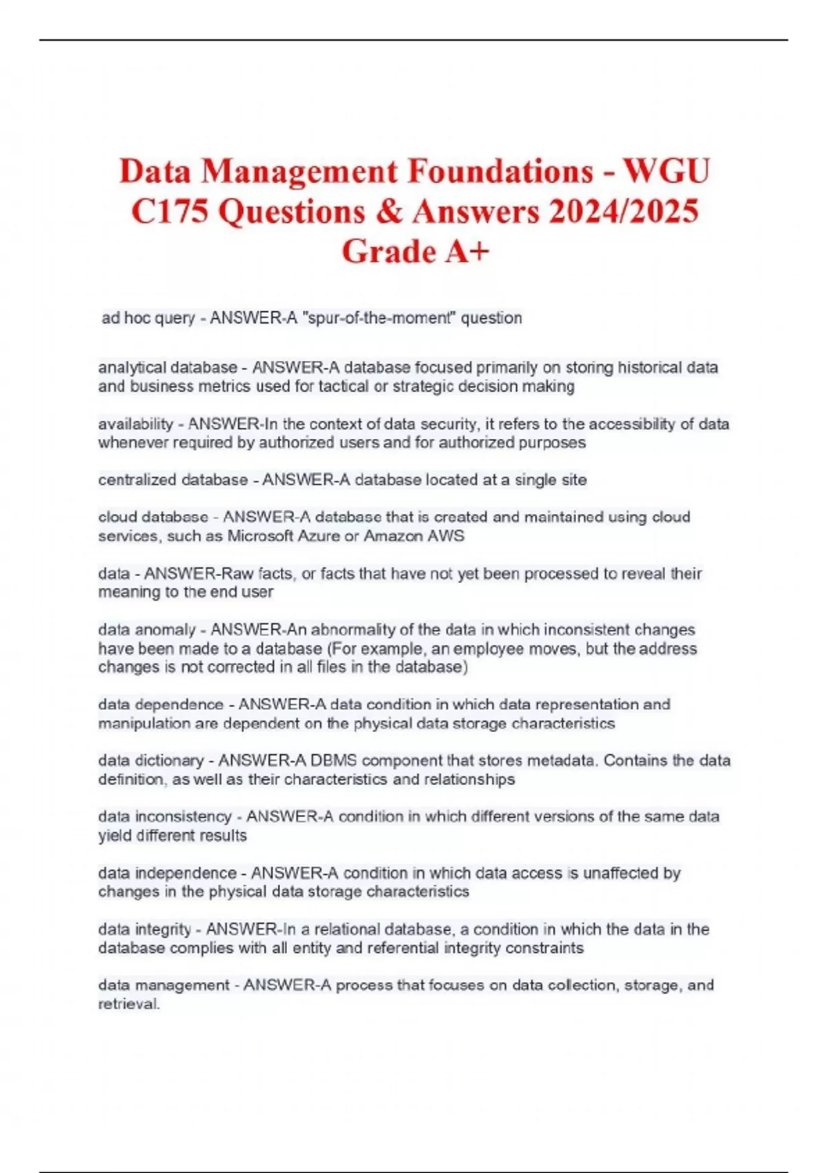 Data Management Foundations - WGU C175 Questions & Answers 2024/2025 Grade A+