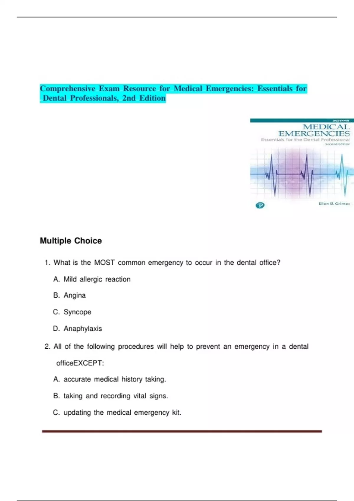 Comprehensive Exam Resource for Medical Emergencies: Essentials for Dental Professionals, 2nd Edition by Ellen Grimes | Full Chapter-by-Chapter Guide (1-23),|newest edition 2025 A+.