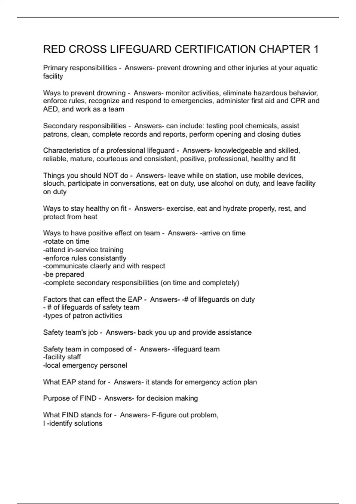 Primary responsibilities - Answers- prevent drowning and other injuries at your aquatic