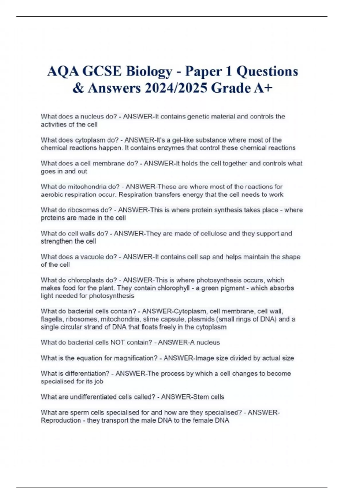 AQA GCSE Biology - Paper 1 Questions & Answers 2024/2025 Grade A+ What does a nucleus do? - ANSWER-It contains genetic material and controls the activities of the cell What does cytoplasm do? - ANSWER-It's a gel-like substance where most of the chemical reactions happen. It contains enzymes that control these chemical reactions What does a cell membrane do? - ANSWER-It holds the cell together and controls what goes in and out What do mitochondria do? - ANSWER-These are where most of the reactions for aerobic respiration occur. Respiration transfers energy that the cell needs to work What do ribosomes do? - ANSWER-This is where protein synthesis takes place - where proteins are made in the cell What do cell walls do? - ANSWER-They are made of cellulose and they support and strengthen the cell What does a vacuole do? - ANSWER-It contains cell sap and helps maintain the shape of the cell What do chloroplasts do? - ANSWER-This is where photosynthesis occurs, which makes food for the plant. They contain chlorophyll - a green pigment - which absorbs light needed for photosynthesis What do bacterial cells contain? - ANSWER-Cytoplasm, cell membrane, cell wall, flagella, ribosomes, mitochondria, slime capsule, plasmids (small rings of DNA) and a single circular strand of DNA that floats freely in the cytoplasm What do bacterial cells NOT contain? - ANSWER-A nucleus What is the equation for magnification? - ANSWER-Image size divided by actual size What is differentiation? - ANSWER-The process by which a cell changes to become specialised for its job What are undifferentiated cells called? - ANSWER-Stem cells What are sperm cells specialised for and how are they specialised? - ANSWER-Reproduction - they transport the male DNA to the female DNA -It has a flagella and a streamlined head to help it swim towards the egg -There are lots of mitochondria in the cell to provide the energy needed -It carries enzymes in its head to help digest through the egg cell membranes What are nerve cells specialised for and how are they specialised? - ANSWER-Rapid signalling - they carry electrical signals from one part of the body to another -They are long to cover more distance -They have branched connections at their ends to connect to other nerve cells and form a network throughout the body What are muscle cells specialised for and how are they specialised? - ANSWER-Contraction - they need to contract quickly -They are long so they have space to contract -They contain lots of mitochondria to generate the energy needed for contraction What are root hair cells specialised for and how are they specialised? - ANSWER-Absorbing water and minerals -They are cells on the surface of plant roots which grow into long hairs that stick out into the soil -They have a large surface area for absorbing water and mineral ions from the soil What are chromosomes? - ANSWER-Coiled up lengths of DNA molecules that are found in the nuclei What do multicellular organisms use mitosis for? - ANSWER-To grow or replace cells that have been damaged What are stem cells? - ANSWER-They are undifferentiated cells that divide to produce lots more undifferentiated cells. They then differentiate into different types of cell Where are stem cells found? - ANSWER-In early human embryos or the bone marrow of adults Continues...