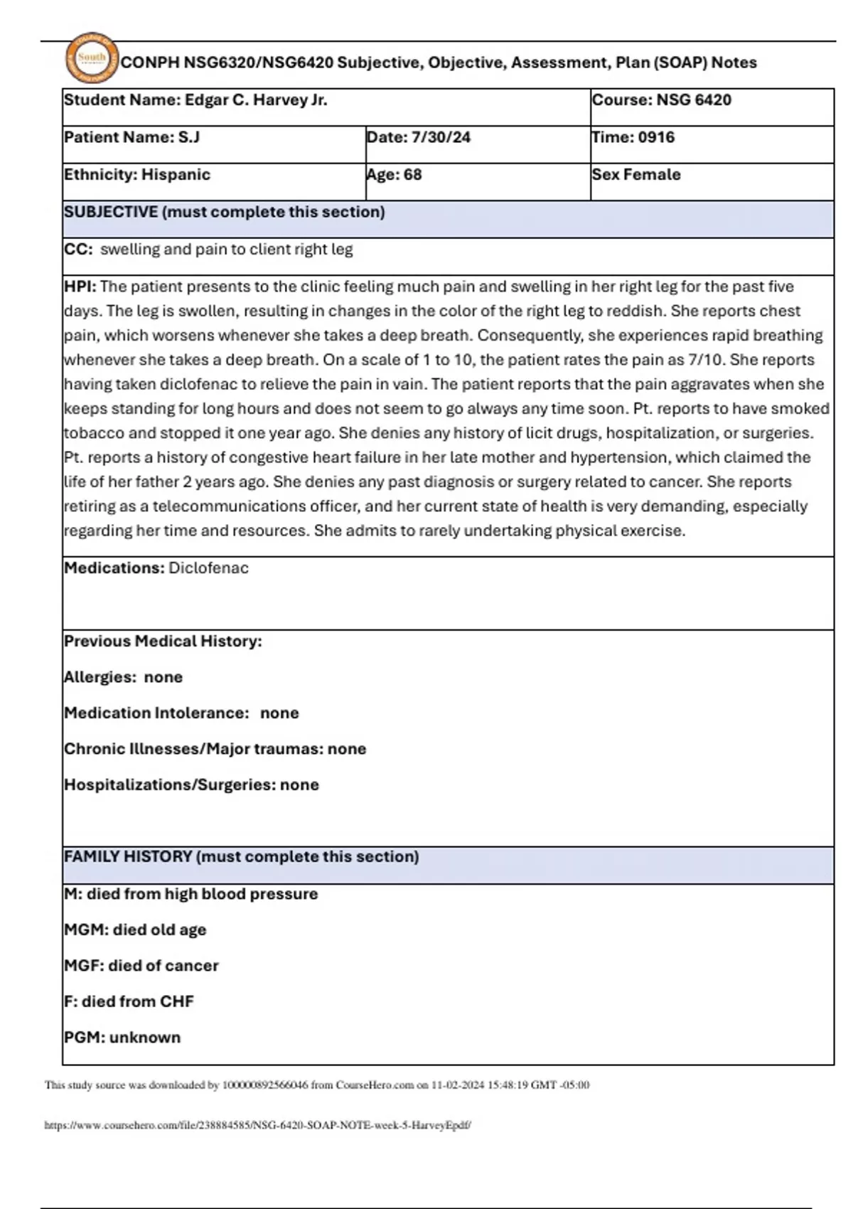 CONPH NSG6320/NSG6420 Subjective, Objective, Assessment, Plan (SOAP) Note week 5 CC: swelling and pain to client right leg.