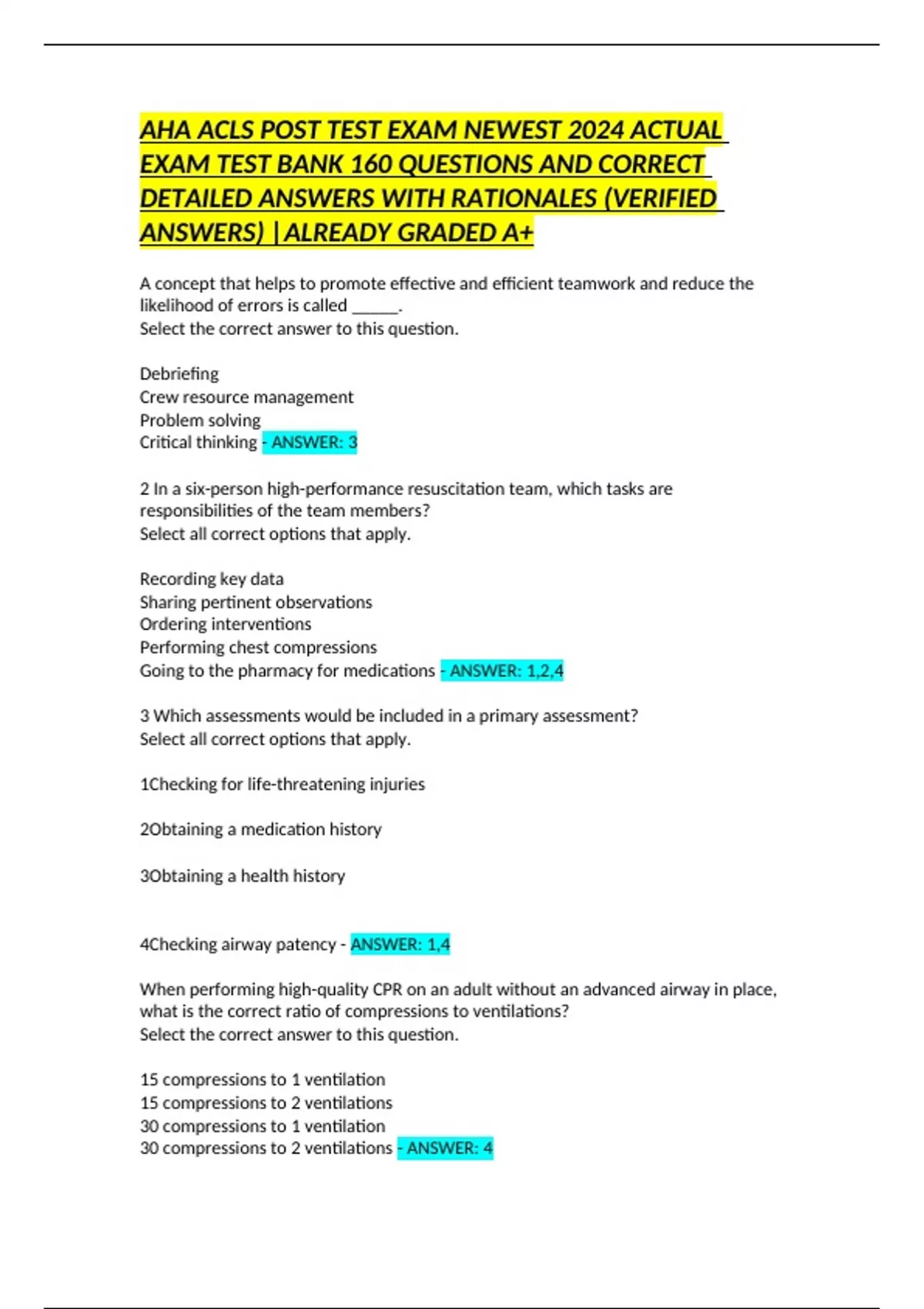AHA ACLS POST TEST EXAM NEWEST 2024 ACTUAL EXAM TEST BANK 160 QUESTIONS AND CORRECT DETAILED ANSWERS WITH RATIONALES (VERIFIED ANSWERS) |ALREADY GRADED A+