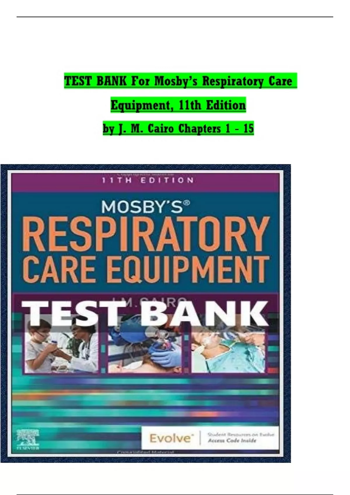 Test Bank for Mosby's Respiratory Care Equipment, 11th Edition 11e by James M. Cairo. Full Chapters test bank are included - Chap 1 to 15 (Complete test bank) SECTION I: Introduction 1. Basic Physics for the Respiratory Therapist 2. Principles of Infection Control SECTION II: Medical Gases 3. Manufacture, Storage, and Transport of Medical Gases 4. Administering Medical Gases: Regulators, Flowmeters, and Controlling Devices SECTION III: Airway Management 5. Airway Management Devices and Advanced Cardiac Life Support 6. Humidity and Aerosol Therapy 7. Lung Expansion Therapy and Airway Clearance Devices SECTION IV: Assessment 8. Assessment of Pulmonary Function 9. Assessment of Cardiovascular Function 10. Blood Gas Monitoring 10. Lung Expansion Devices 11. Sleep Diagnostics SECTION V: Critical Care and Other Therapies 12. Introduction to Ventilators 13. Mechanical Ventilators: General Use Devices 14. Infant and Pediatric Devices 15. Transport, Home Care, and Noninvasive Devices All Chapters Multiple Choice questions are given with answers.