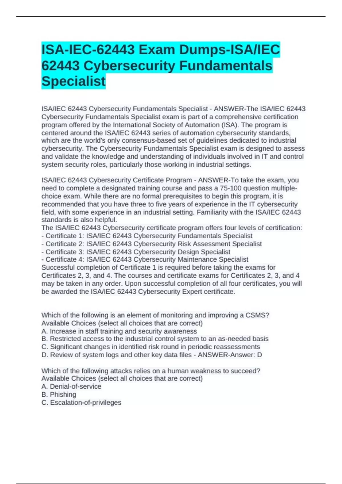 ISA-IEC-62443 Exam Dumps-ISA/IEC 62443 Cybersecurity Fundamentals SpecialistISA-IEC-62443 Exam Dumps-ISA/IEC 62443 Cybersecurity Fundamentals SpecialistISA-IEC-62443 Exam Dumps-ISA/IEC 62443 Cybersecurity Fundamentals SpecialistISA-IEC-62443 Exam Dumps-ISA/IEC 62443 Cybersecurity Fundamentals SpecialistISA/IEC 62443 Cybersecurity Fundamentals Specialist - ANSWER-The ISA/IEC 62443 Cybersecurity Fundamentals Specialist exam is part of a comprehensive certification program offered by the International Society of Automation (ISA). The program is centered around the ISA/IEC 62443 series of automation cybersecurity standards, which are the world's only consensus-based set of guidelines dedicated to industrial cybersecurity. The Cybersecurity Fundamentals Specialist exam is designed to assess and validate the knowledge and understanding of individuals involved in IT and control system security roles, particularly those working in industrial settings. ISA/IEC 62443 Cybersecurity Certificate Program - ANSWER-To take the exam, you need to complete a designated training course and pass a 75-100 question multiple-choice exam. While there are no formal prerequisites to begin this program, it is recommended that you have three to five years of experience in the IT cybersecurity