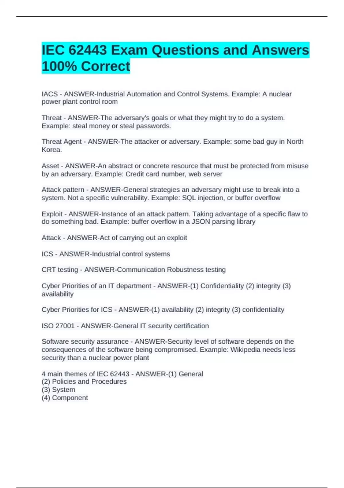 IEC 62443 Exam Questions and Answers 100% CorrectIEC 62443 Exam Questions and Answers 100% CorrectIEC 62443 Exam Questions and Answers 100% CorrectIEC 62443 Exam Questions and Answers 100% Correct IACS - ANSWER-Industrial Automation and Control Systems. Example: A nuclear power plant control room Threat - ANSWER-The adversary's goals or what they might try to do a system. Example: steal money or steal passwords. Threat Agent - ANSWER-The attacker or adversary. Example: some bad guy in North Korea. Asset - ANSWER-An abstract or concrete resource that must be protected from misuse by an adversary. Example: Credit card number, web server