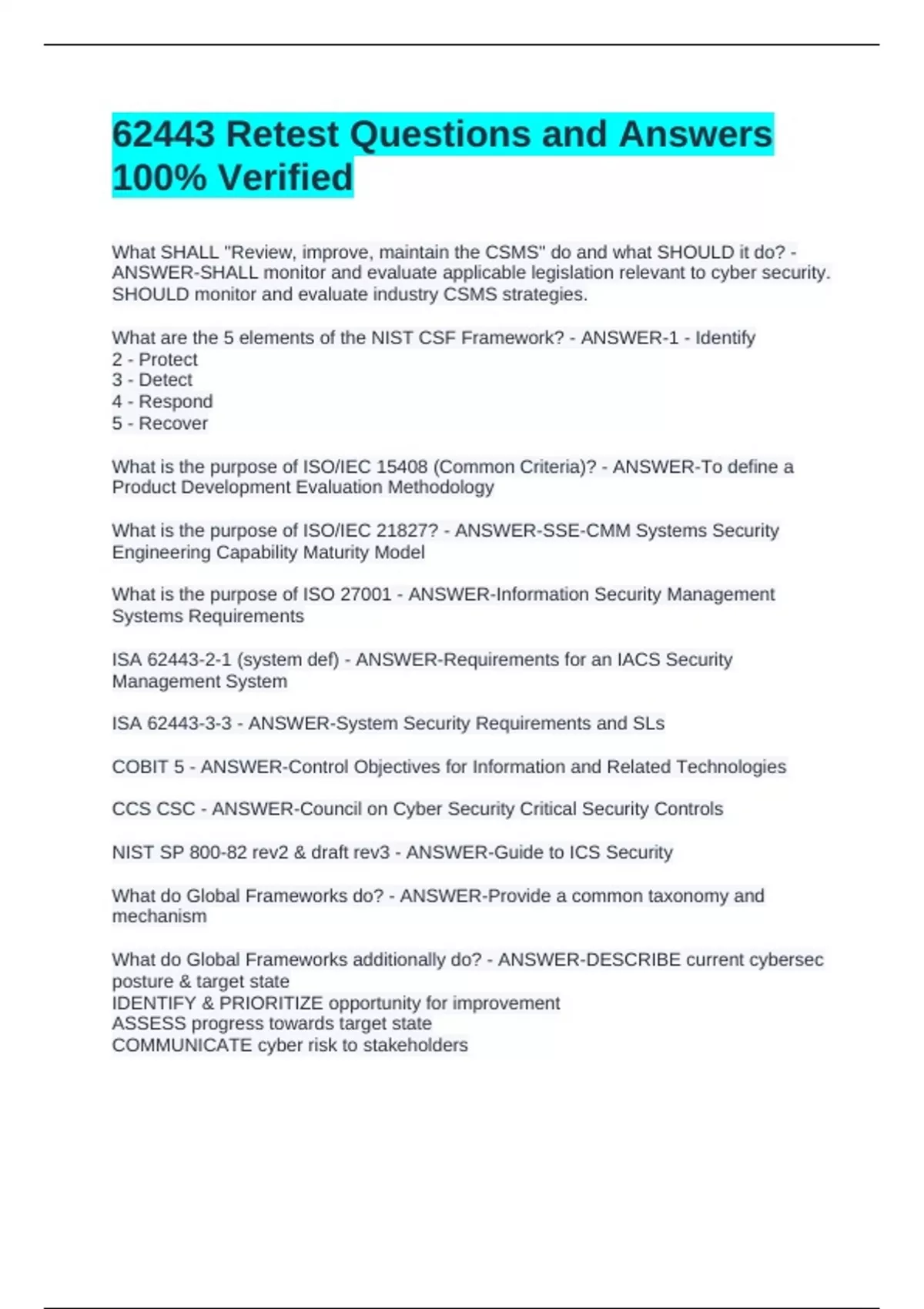 62443 Retest Questions and Answers 100% Verified 62443 Retest Questions and Answers 100% Verified 62443 Retest Questions and Answers 100% Verified What SHALL "Review, improve, maintain the CSMS" do and what SHOULD it do? - ANSWER-SHALL monitor and evaluate applicable legislation relevant to cyber security. SHOULD monitor and evaluate industry CSMS strategies. What are the 5 elements of the NIST CSF Framework? - ANSWER-1 - Identify 2 - Protect 3 - Detect 4 - Respond 5 - Recover What is the purpose of ISO/IEC 15408 (Common Criteria)? - ANSWER-To define a Product Development Evaluation Methodology