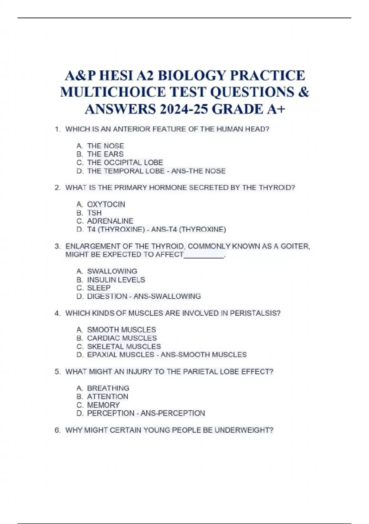 A&P HESI A2 BIOLOGY PRACTICE MULTICHOICE TEST QUESTIONS & ANSWERS 2024-25 GRADE A+ 1. WHICH IS AN ANTERIOR FEATURE OF THE HUMAN HEAD? A. THE NOSE B. THE EARS C. THE OCCIPITAL LOBE D. THE TEMPORAL LOBE - ANS-THE NOSE 2. WHAT IS THE PRIMARY HORMONE SECRETED BY THE THYROID? A. OXYTOCIN B. TSH C. ADRENALINE D. T4 (THYROXINE) - ANS-T4 (THYROXINE) 3. ENLARGEMENT OF THE THYROID, COMMONLY KNOWN AS A GOITER, MIGHT BE EXPECTED TO AFFECT__________. A. SWALLOWING B. INSULIN LEVELS C. SLEEP D. DIGESTION - ANS-SWALLOWING 4. WHICH KINDS OF MUSCLES ARE INVOLVED IN PERISTALSIS? A. SMOOTH MUSCLES B. CARDIAC MUSCLES C. SKELETAL MUSCLES D. EPAXIAL MUSCLES - ANS-SMOOTH MUSCLES 5. WHAT MIGHT AN INJURY TO THE PARIETAL LOBE EFFECT? A. BREATHING B. ATTENTION C. MEMORY D. PERCEPTION - ANS-PERCEPTION 6. WHY MIGHT CERTAIN YOUNG PEOPLE BE UNDERWEIGHT? A. THEY ARE GROWING IN HEIGHT FASTER THAN THEY ARE GAINING WEIGHT. B. THEY EAT LITTLE PROTEIN AND TOO MUCH FAT AND SUGAR. C. THEY EAT SEVERAL MEALS A DAY AND FAIL TO EXERCISE ENOUGH. D. THEY SELDOM EAT A MEAL THAT CONTAINS FOODS FROM ALL FOOD GROUPS. - ANS-THEY ARE GROWING IN HEIGHT FASTER THAN THEY ARE GAINING WEIGHT. 7. HOW DOES THE DIGESTIVE SYSTEM WORK WITH THE URINARY SYSTEM? A. THE DIGESTIVE SYSTEM CONTROLS THE FUNCTIONS OF THE URETER. B. THE URINARY SYSTEM REMOVES TOXINS FROM THE PRODUCTS OF URINATION. C. THE DIGESTIVE SYSTEM MANUFACTURES HORMONES THAT INFLUENCE URINATION. D. THE URINARY SYSTEM ELIMINATES SOME WASTE PRODUCTS OF DIGESTION. - ANS-THE URINARY SYSTEM CONTINUES.....