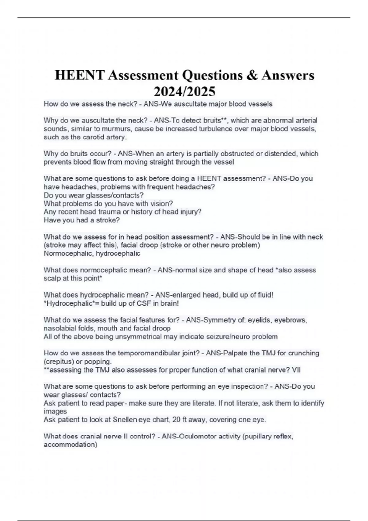 HEENT Assessment Questions & Answers 2024/2025 How do we assess the neck? - ANS-We auscultate major blood vessels Why do we auscultate the neck? - ANS-To detect bruits**, which are abnormal arterial sounds, similar to murmurs, cause be increased turbulence over major blood vessels, such as the carotid artery. Why do bruits occur? - ANS-When an artery is partially obstructed or distended, which prevents blood flow from moving straight through the vessel What are some questions to ask before doing a HEENT assessment? - ANS-Do you have headaches, problems with frequent headaches? Do you wear glasses/contacts? What problems do you have with vision? Any recent head trauma or history of head injury? Have you had a stroke? What do we assess for in head position assessment? - ANS-Should be in line with neck (stroke may affect this), facial droop (stroke or other neuro problem) Normocephalic, hydrocephalic What does normocephalic mean? - ANS-normal size and shape of head *also assess scalp at this point* What does hydrocephalic mean? - ANS-enlarged head, build up of fluid! *Hydrocephalic*= build up of CSF in brain! What do we assess the facial features for? - ANS-Symmetry of: eyelids, eyebrows, nasolabial folds, mouth and facial droop All of the above being unsymmetrical may indicate seizure/neuro problem How do we assess the temporomandibular joint? - ANS-Palpate the TMJ for crunching (crepitus) or popping. **assessing the TMJ also assesses for proper function of what cranial nerve? VII What are some questions to ask before performing an eye inspection? - ANS-Do you wear glasses/ contacts? CONTINUES....