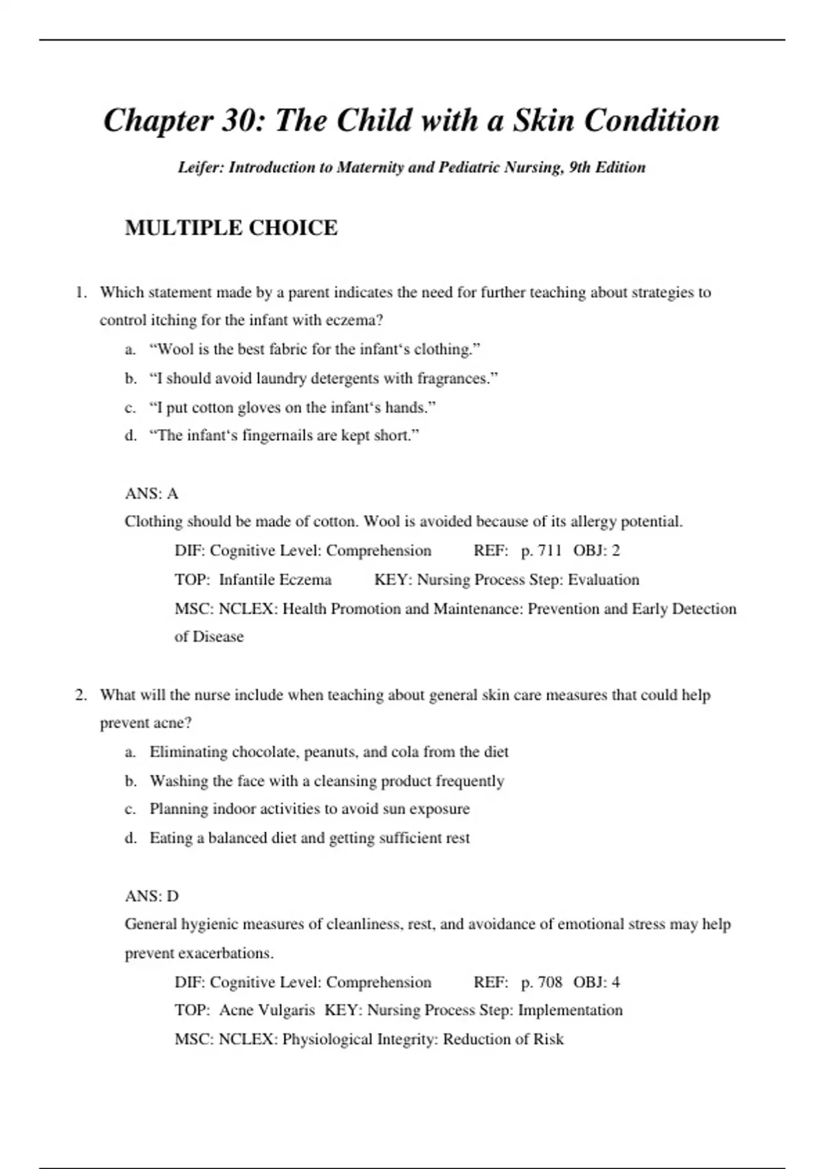 MULTIPLE CHOICE 1. Which statement made by a parent indicates the need for further teaching about strategies to control itching for the infant with eczema? a. “Wool is the best fabric for the infant‘s clothing.” b. “I should avoid laundry detergents with fragrances.” c. “I put cotton gloves on the infant‘s hands.” d. “The infant‘s fingernails are kept short.” ANS: A Clothing should be made of cotton. Wool is avoided because of its allergy potential. DIF: Cognitive Level: Comprehension REF: p. 711 OBJ: 2 TOP: Infantile Eczema KEY: Nursing Process Step: Evaluation MSC: NCLEX: Health Promotion and Maintenance: Prevention and Early Detection of Disease 2. What will the nurse include when teaching about general skin care measures that could help prevent acne? a. Eliminating chocolate, peanuts, and cola from the diet b. Washing the face with a cleansing product frequently c. Planning indoor activities to avoid sun exposure d. Eating a balanced diet and getting sufficient rest ANS: D General hygienic measures of cleanliness, rest, and avoidance of emotional stress may help prevent exacerbations. DIF: Cognitive Level: Comprehension REF: p. 708 OBJ: 4 TOP: Acne Vulgaris KEY: Nursing Process Step: Implementation MSC: NCLEX: Physiological Integrity: Reduction of Risk 3. The nurse caring for a patient with severe frostbite observes a purple flush on the hands and feet. What is the most appropriate nursing action? a. Report this sign immediately. b. Place a warm towel over the extremities. c. Gently sponge with cool water. d. Medicate for pain.