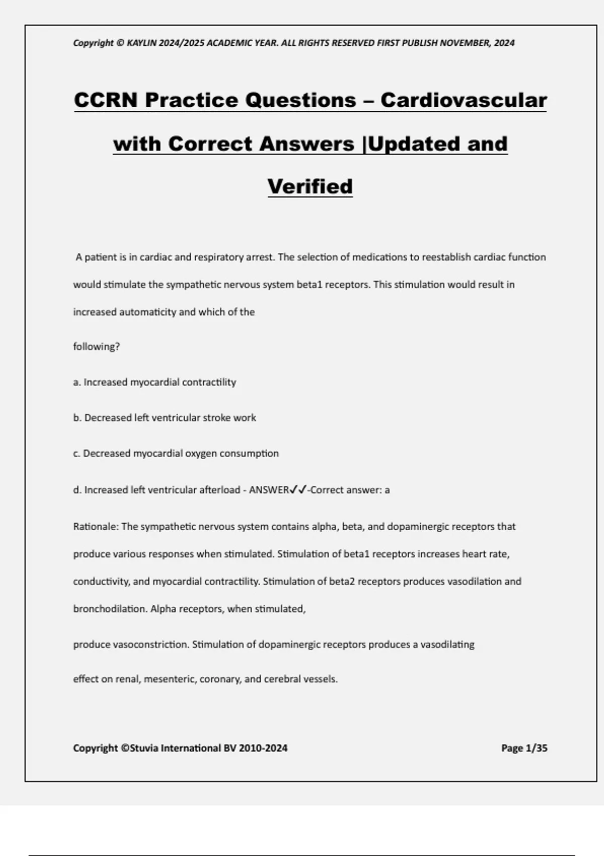 CCRN Practice Questions – Cardiovascular with Correct Answers |Updated and Verified A patient is in cardiac and respiratory arrest. The selection of medications to reestablish cardiac function would stimulate the sympathetic nervous system beta1 receptors. This stimulation would result in increased automaticity and which of the following? a. Increased myocardial contractility b. Decreased left ventricular stroke work c. Decreased myocardial oxygen consumption d. Increased left ventricular afterload - ANSWER-Correct answer: a Rationale: The sympathetic nervous system contains alpha, beta, and dopaminergic receptors that produce various responses when stimulated. Stimulation of beta1 receptors increases heart rate, conductivity, and myocardial contractility. Stimulation of beta2 receptors produces vasodilation and bronchodilation. Alpha receptors, when stimulated, produce vasoconstriction. Stimulation of dopaminergic receptors produces a vasodilating effect on renal, mesenteric, coronary, and cerebral vessels. Copyright © KAYLIN 2024/2025 ACADEMIC YEAR. ALL RIGHTS RESERVED FIRST PUBLISH NOVEMBER, 2024 Copyright ©Stuvia International BV Page 2/35 Test-Taking Strategy: Note the helpful clue in the stem: stimulate the sympathetic system and recall that this results in a fight-or-flight response—the body is responding to survive. Stroke volume would increase, so eliminate option b. Afterload would increase, but this is due to alpha stimulation, not beta1 stimulation, so eliminate option d. Because the heart is working faster and harder, the myocardial oxygen consumption does increase, so eliminate option c. Remember that the primary effects of beta1 receptors are to increase heart rate, contractility, and rate of conduction. Choose option a. A memory aid that also may help is this: beta 1 beta 2, 1 heart 2 lungs: beta1 affects the heart, and beta2 affects the lungs. A patient arrived in the emergency department with complaints of chest pain. The 12-lead electrocardiogram shows ST segment elevation in leads V3 and V4. Occlusion of the affected coronary artery most likely would affect perfusion to which portion of the conduction system? a. Sinoatrial (SA) node b. Bachmann's bundle c. Atrioventricular (AV) node d. Bundle of His - ANSWER-Correct answer: d Rationale: ST segment elevation in leads V3 and V4 indicates injury to the anterior wall, which would occur with occlusion of the left anterior descending (LAD) artery. In most persons, the SA node, Bachmann's bundle, and AV node are supplied by the right coronary artery. The bundle of His is supplied by the left anterior descending artery. This is why an anterior myocardial infarction may cause type II second-degree AV block or third-degree AV heart block at the level of the bundle of His. Copyright © KAYLIN 2024/2025 ACADEMIC YEAR. ALL RIGHTS RESERVED FIRST PUBLISH NOVEMBER, 2024 Copyright ©Stuvia International BV Page 3/35 Test-Taking Strategy: Note that options a, b, and c are part of the supraventricular conduction system. They usually are supplied by the right coronary artery. The LAD artery supplies most of the interventricular conduction system, including the bundle of His and the bundle branches. Oxygen delivery (DO2) is the product of which of the following? a. PaO2, hemoglobin, mean arterial pressure b. SaO2, hemoglobin, cardiac output c. SvO2, cardiac index, SaO2 d. PaO2, mean arterial pressure, SvO2 - ANSWER-Correct answer: b Rationale: Ninety-seven percent of oxygen is attached to the hemoglobin molecule, so the SaO2 (arterial oxygen saturation) is a more accurate reflection of the amount of oxygen in blood. The PaO2 represents only the 3% that is dissolved in the plasma. The lungs must put the oxygen in the blood, the hemoglobin must carry the oxygen, and the cardiac output is a reflection of how well the heart is moving the blood with its hemoglobin with attached oxygen. SvO2 (venous oxygen saturation) is a reflection of the oxygen reserve. SvO2 is what is left over after the tissues have extracted what they need. The mean arterial pressure is a reflection of organ tissue perfusion pressure but does not indicate anything about the amount of oxygen in that blood. Test-Taking Strategy: Oxygen is delivered from the arterial end, so choose an option that has SaO2 instead of SvO2. Also remember that most oxygen is carried on hemoglobin. Look for SaO2 (not PaO2) and hemoglobin. The only option with both of these is option b. Which of the following types of block are most likely after an anterior wall myocardial infarction (MI)? Copyright © KAYLIN 2024/2025 ACADEMIC YEAR. ALL RIGHTS RESERVED FIRST PUBLISH NOVEMBER, 2024 Copyright ©Stuvia International BV Page 4/35 a. Sinus block b. Second-degree atrioventricular (AV) block, type I c. Second-degree AV block, type II d. Third-degree AV block with junctional escape rhythm - ANSWER-Correct answer: c Rationale: Anterior MI is caused by a left anterior descending (LAD) artery lesion. The LAD artery supplies the bundle of His and bundle branches, so anterior MIs may cause blocks of the bundle of His or bundle branches. Second-degree AV block type II is a block at the level of the bundle of His. If this patient does develop a third-degree AV block, it would be at the level of the bundle of His, and the only escape rhythm available below the bundle of His is a ventricular escape rhythm. Test-Taking Strategy: The sinus node is supplied by right coronary artery (in 55% of people) or left coronary artery (in 45% of people), so eliminate option a. Type I AV block, also called Wenckebach, is a block at the AV node, and the AV node is supplied by right coronary artery (in 90% of people) or left coronary artery (10%), so eliminate option b. The LAD artery supplies the bundle of His, and blocks in this area would eliminate the possibility of junctional escape rhythms, so eliminate option d. Choose option c. A patient develops atrial fibrillation after abdominal surgery. Her blood pressure falls