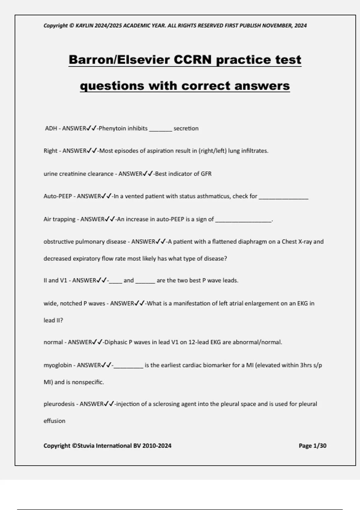 Barron/Elsevier CCRN practice test questions with correct answers ADH - ANSWER-Phenytoin inhibits _______ secretion Right - ANSWER-Most episodes of aspiration result in (right/left) lung infiltrates. urine creatinine clearance - ANSWER-Best indicator of GFR Auto-PEEP - ANSWER-In a vented patient with status asthmaticus, check for _______________ Air trapping - ANSWER-An increase in auto-PEEP is a sign of _________________. obstructive pulmonary disease - ANSWER-A patient with a flattened diaphragm on a Chest X-ray and decreased expiratory flow rate most likely has what type of disease? II and V1 - ANSWER-____ and ______ are the two best P wave leads. wide, notched P waves - ANSWER-What is a manifestation of left atrial enlargement on an EKG in lead II? normal - ANSWER-Diphasic P waves in lead V1 on 12-lead EKG are abnormal/normal. myoglobin - ANSWER-_________ is the earliest cardiac biomarker for a MI (elevated within 3hrs s/p MI) and is nonspecific. pleurodesis - ANSWER-injection of a sclerosing agent into the pleural space and is used for pleural effusion Copyright © KAYLIN 2024/2025 ACADEMIC YEAR. ALL RIGHTS RESERVED FIRST PUBLISH NOVEMBER, 2024 Copyright ©Stuvia International BV Page 2/30 LAD - ANSWER-The__________ coronary artery supplies the bundle of His and bundle branches anterior (LAD affected) - ANSWER-_____________ MIs may cause blocks of the bundle of His or bundle branches Right Coronary Artery (RCA)... LCA in 10% of ppl - ANSWER-Type I AV block, also called Wenckebach, is a block at the AV node, and the AV node is supplied by the ___________________ (in 90% of people) sinus - ANSWER-the ____________ node is supplied by the RCA in 55% of ppl and LCA in 45% pale and shiny - ANSWER-The skin changes associated with chronic peripheral arterial disease pain, pallor, pulselessness, paresthesia, paralysis, and polar (cold) - ANSWER-what are the 6 Ps of acute arterial occlusion? less - ANSWER-There is (more/less) risk of burning of the skin with biphasic waveform defibrillation than with monophasic. necrosis - ANSWER-adding too much air to a ETT cuff can cause overinflation and tracheal ______________. myocardial infarction (MI) - ANSWER-What is the most common cause of death after vascular surgery? CAD - ANSWER-Because atherosclerosis does not occur in one vessel, patients requiring vascular surgery are likely also to have ___________________________. dissecting aortic aneurysm - ANSWER-The first diagnostic test should be a CXR film for probable diagnosis. The film would reveal a widening mediastinum. An additional, more indicative finding would be calcified aortic knob with extension of the aortic wall. Copyright © KAYLIN 2024/2025 ACADEMIC YEAR. ALL RIGHTS RESERVED FIRST PUBLISH NOVEMBER, 2024 Copyright ©Stuvia International BV Page 3/30 left - ANSWER-A wide, notched P wave is an indication of ________ atrial enlargement. P mitrale - ANSWER-Left atrial enlargement causes the P wave to be wide (greater than 0.1 second) and notched. This sometimes is referred to as ___ __________. mitral - ANSWER-___________ valve stenosis causes LA enlargement and wide, notched P Waves RCA (as seen in inferior wall MIs) - ANSWER-SA blocks, second-degree AV block type I, and third- degree AV heart block at the level of the AV node would occur in _______________ occlusion left - ANSWER-The anterolateral heart wall is supplied by the ______ coronary artery right - ANSWER-The SA node and the atrioventricular (AV) node are supplied by the ________ coronary artery in most hearts. AV - ANSWER-second degree Type I AV block is located anatomically at the _____ node Bundle of His - ANSWER-Second degree AV block Type II is located anatomically at the ________________. junctional escape - ANSWER-A third-degree AV heart block would have to be blocked above the bundle of His to have what kind of rhythm? erythropoietin (EPO) - ANSWER-The hypoxemia that results from COPD causes release of _______________ from the kidney, which stimulates release of red blood cells from the bone marrow and polycythemia COPD causes pulmonary hypertension, right ventricular hypertrophy, and right atrial enlargement. The right atrial enlargement causes stretching of the atrial tissue and frequently results in atrial dysrhythmias. - ANSWER-How does COPD result in atrial fibrillation and predisposition to PEs? Copyright © KAYLIN 2024/2025 ACADEMIC YEAR. ALL RIGHTS RESERVED FIRST PUBLISH NOVEMBER, 2024 Copyright ©Stuvia International BV Page 4/30 Nitrates - ANSWER-___________ are used primarily as antispasmodics in cath lab patients. widened - ANSWER-(Widened/narrowed) pulse pressure is associated with aortic regurgitation narrowed - ANSWER-(Widened/narrowed) pulse pressure is associated with mitral regurgitation diastolic - ANSWER-mitral stenosis causes a (systolic/diastolic) murmur. mitral stenosis - ANSWER-_____________ stenosis results in pinkish discoloration of the cheeks, aka "malar blush." programmability - ANSWER-_____________________ is the ability to noninvasively change one of several aspects of the function of a pacemaker, using a device placed over the pulse generator. Pressure-controlled inverse ratio ventilation - ANSWER-______________________________ ventilation, which flips the normal inspiration/expiration ratio to make inspiration longer than expiration, allows trapping of air in the lungs. This inadvertent PEEP is called auto-PEE