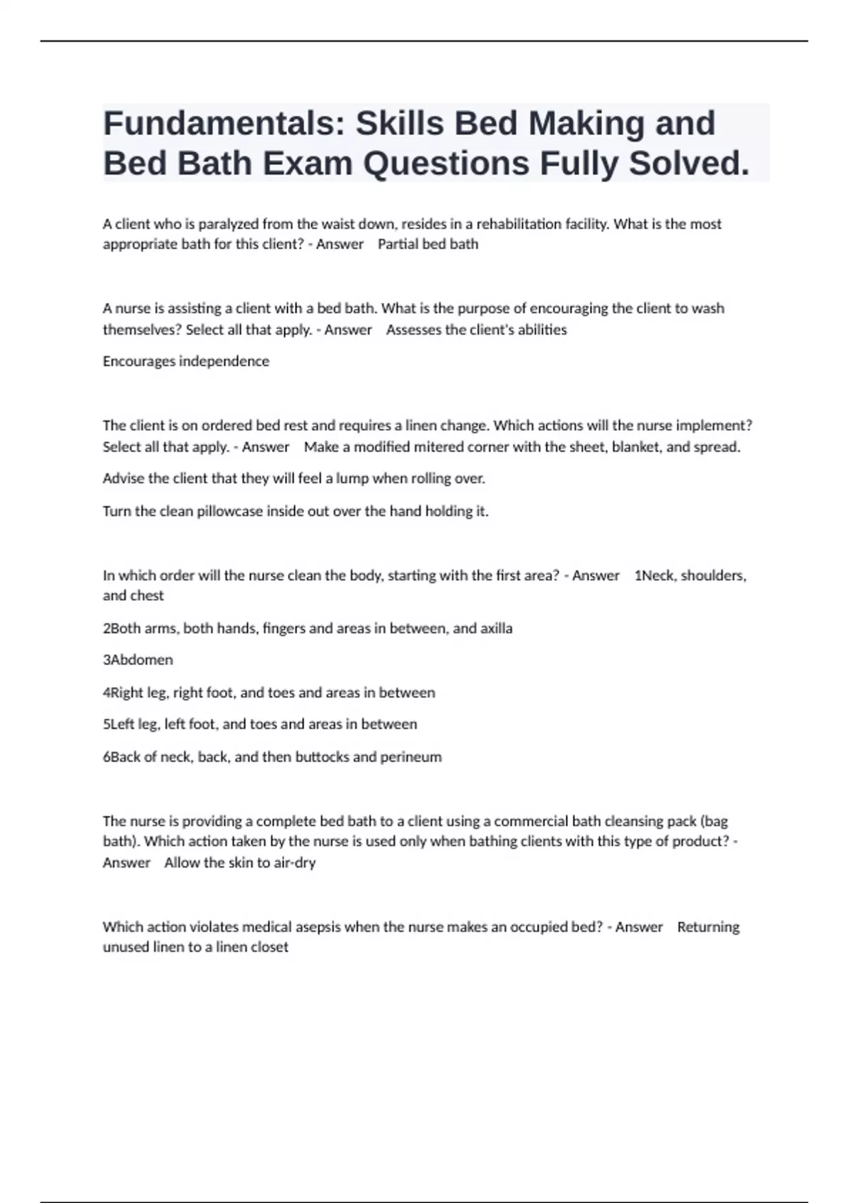 A client who is paralyzed from the waist down, resides in a rehabilitation facility. What is the most appropriate bath for this client? - Answer Partial bed bath A nurse is assisting a client with a bed bath. What is the purpose of encouraging the client to wash themselves? Select all that apply. - Answer Assesses the client's abilities Encourages independence The client is on ordered bed rest and requires a linen change. Which actions will the nurse implement? Select all that apply. - Answer Make a modified mitered corner with the sheet, blanket, and spread. Advise the client that they will feel a lump when rolling over. Turn the clean pillowcase inside out over the hand holding it. In which order will the nurse clean the body, starting with the first area? - Answer 1Neck, shoulders, and chest 2Both arms, both hands, fingers and areas in between, and axilla 3Abdomen 4Right leg, right foot, and toes and areas in between 5Left leg, left foot, and toes and areas in between 6Back of neck, back, and then buttocks and perineum The nurse is providing a complete bed bath to a client using a commercial bath cleansing pack (bag bath). Which action taken by the nurse is used only when bathing clients with this type of product? - Answer Allow the skin to air-dry Which action violates medical asepsis when the nurse makes an occupied bed? - Answer Returning unused linen to a linen closet