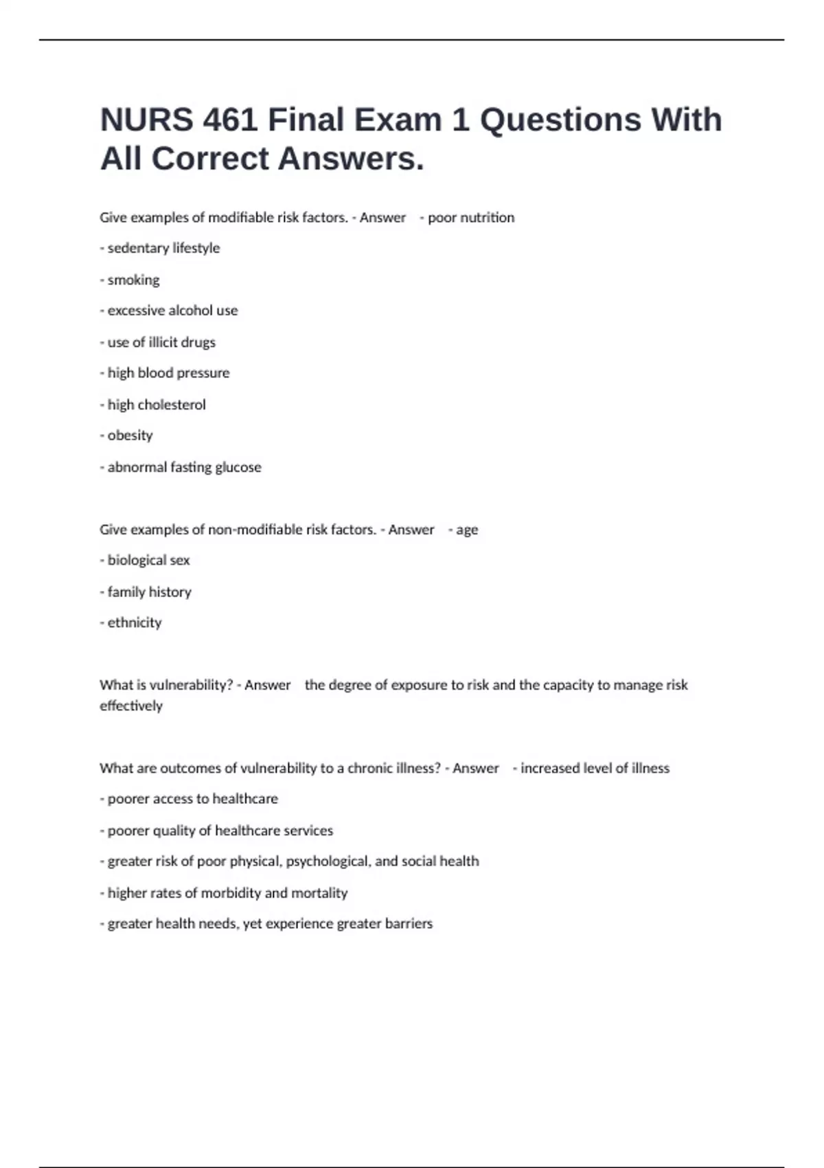Give examples of modifiable risk factors. - Answer - poor nutrition - sedentary lifestyle - smoking - excessive alcohol use - use of illicit drugs - high blood pressure - high cholesterol - obesity - abnormal fasting glucose Give examples of non-modifiable risk factors. - Answer - age - biological sex - family history - ethnicity What is vulnerability? - Answer the degree of exposure to risk and the capacity to manage risk effectively What are outcomes of vulnerability to a chronic illness? - Answer - increased level of illness - poorer access to healthcare - poorer quality of healthcare services - greater risk of poor physical, psychological, and social health - higher rates of morbidity and mortality - greater health needs, yet experience greater barriers