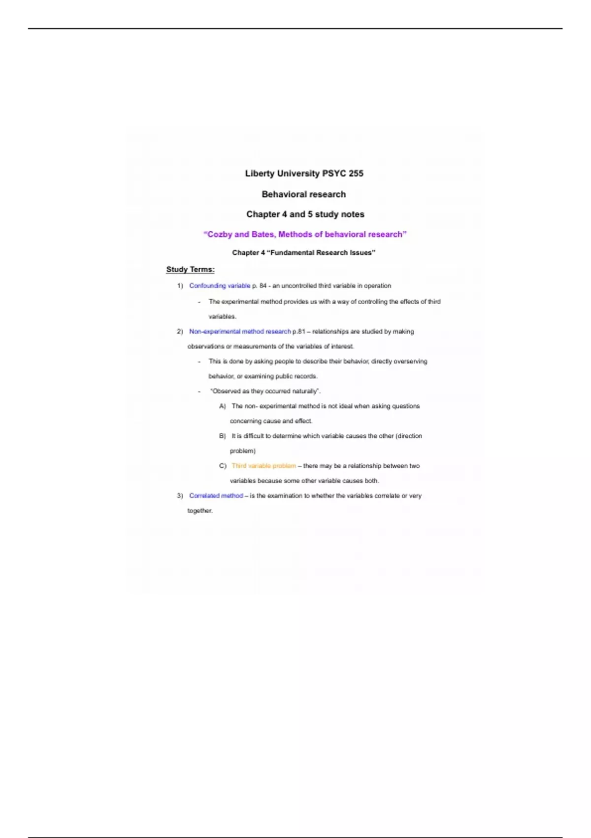 1) Confounding variable p. 84 - an uncontrolled third variable in operation