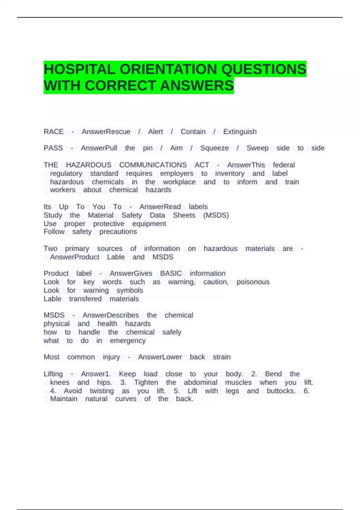 HOSPITAL ORIENTATION QUESTIONS WITH CORRECT ANSWERS