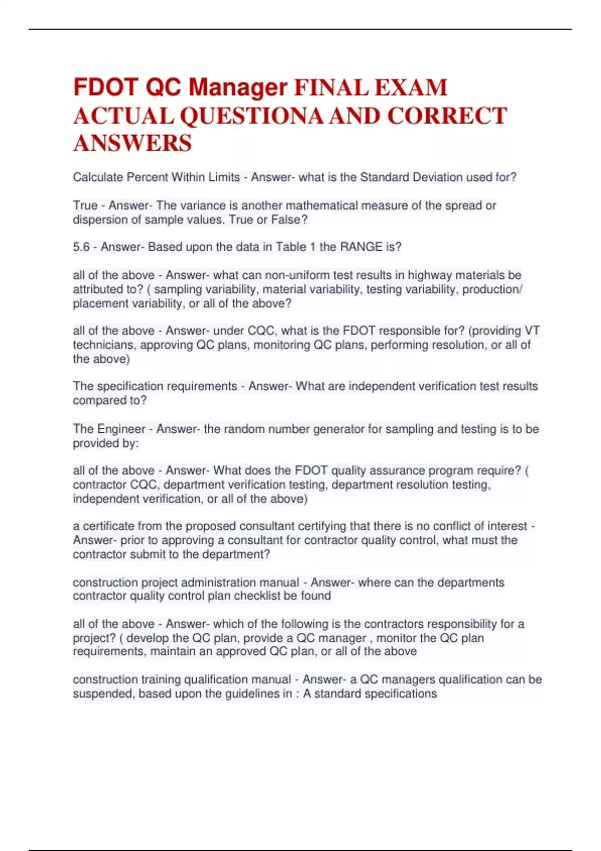 FDOT QC Manager FINAL EXAM ACTUAL QUESTIONA AND CORRECT ANSWERS Calculate Percent Within Limits - Answer- what is the Standard Deviation used for? True - Answer- The variance is another mathematical measure of the spread or dispersion of sample values. True or False? 5.6 - Answer- Based upon the data in Table 1 the RANGE is? all of the above - Answer- what can non-uniform test results in highway materials be attributed to? ( sampling variability, material variability, testing variability, production/ placement variability, or all of the above? all of the above - Answer- under CQC, what is the FDOT responsible for? (providing VT technicians, approving QC plans, monitoring QC plans, performing resolution, or all of the above) The specification requirements - Answer- What are independent verification test results compared to? The Engineer - Answer- the random number generator for sampling and testing is to be provided by: all of the above - Answer- What does the FDOT quality assurance program require? ( contractor CQC, department verification testing, department resolution testing, independent verification, or all of the above) a certificate from the proposed consultant certifying that there is no conflict of interest - Answer- prior to approving a consultant for contractor quality control, what must the contractor submit to the department? construction project administration manual - Answer- where can the departments contractor quality control plan checklist be found all of the above - Answer- which of the following is the contractors responsibility for a project? ( develop the QC plan, provide a QC manager , monitor the QC plan requirements, maintain an approved QC plan, or all of the above construction training qualification manual - Answer- a QC managers qualification can be suspended, based upon the guidelines in : A standard specifications