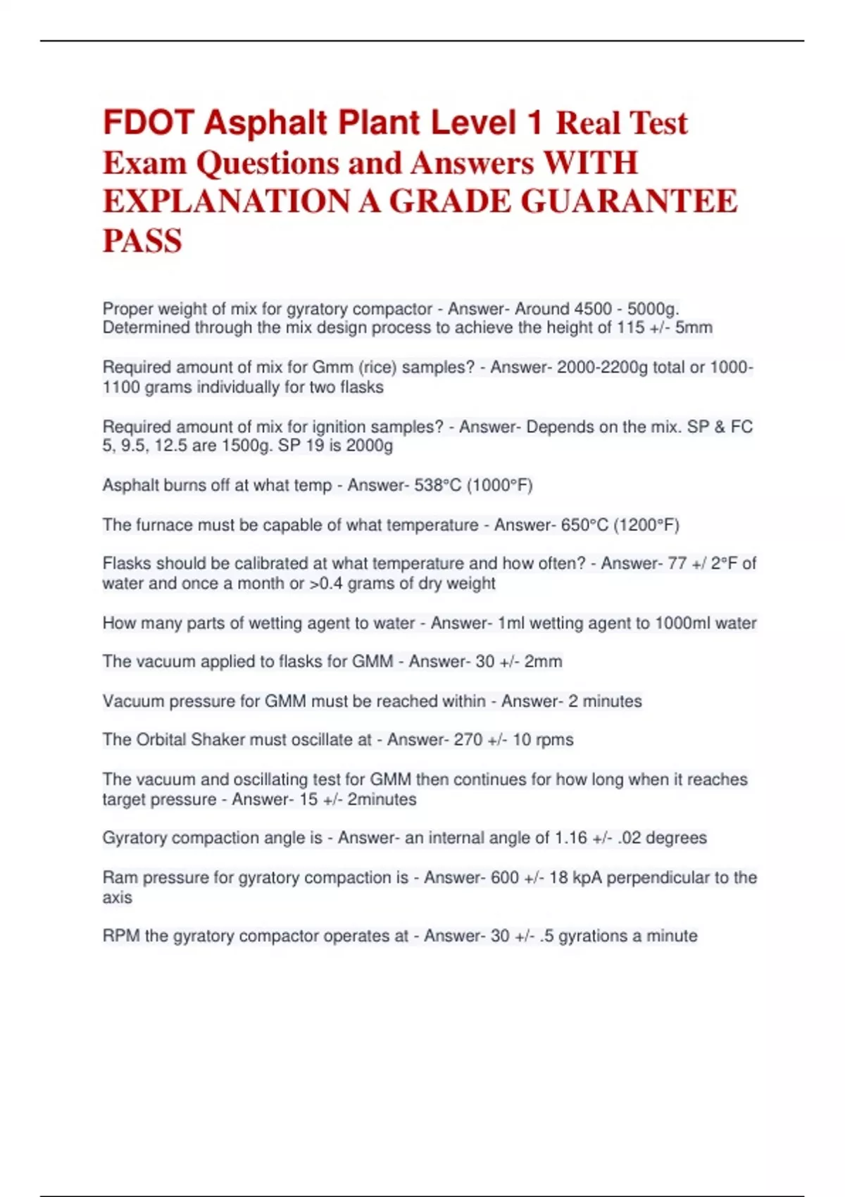 FDOT Asphalt Plant Level 1 Real Test Exam Questions and Answers WITH EXPLANATION A GRADE GUARANTEE PASS Proper weight of mix for gyratory compactor - Answer- Around g. Determined through the mix design process to achieve the height of 115 +/- 5mm Required amount of mix for Gmm (rice) samples? - Answer- g total or grams individually for two flasks Required amount of mix for ignition samples? - Answer- Depends on the mix. SP & FC 5, 9.5, 12.5 are 1500g. SP 19 is 2000g Asphalt burns off at what temp - Answer- 538°C (1000°F) The furnace must be capable of what temperature - Answer- 650°C (1200°F) Flasks should be calibrated at what temperature and how often? - Answer- 77 +/ 2°F of water and once a month or >0.4 grams of dry weight How many parts of wetting agent to water - Answer- 1ml wetting agent to 1000ml water The vacuum applied to flasks for GMM - Answer- 30 +/- 2mm Vacuum pressure for GMM must be reached within - Answer- 2 minutes The Orbital Shaker must oscillate at - Answer- 270 +/- 10 rpms The vacuum and oscillating test for GMM then continues for how long when it reaches target pressure - Answer- 15 +/- 2minutes Gyratory compaction angle is - Answer- an internal angle of 1.16 +/- .02 degrees Ram pressure for gyratory compaction is - Answer- 600 +/- 18 kpA perpendicular to the axis RPM the gyratory compactor operates at - Answer- 30 +/- .5 gyrations a minute Gyratory (GMB) and Rice (GMM) samples must be conditioned at what temp and for how long - Answer- compaction temp +/- 9 for 1 hour +/- 5minutes and mix should be within +/-20° of compaction temp