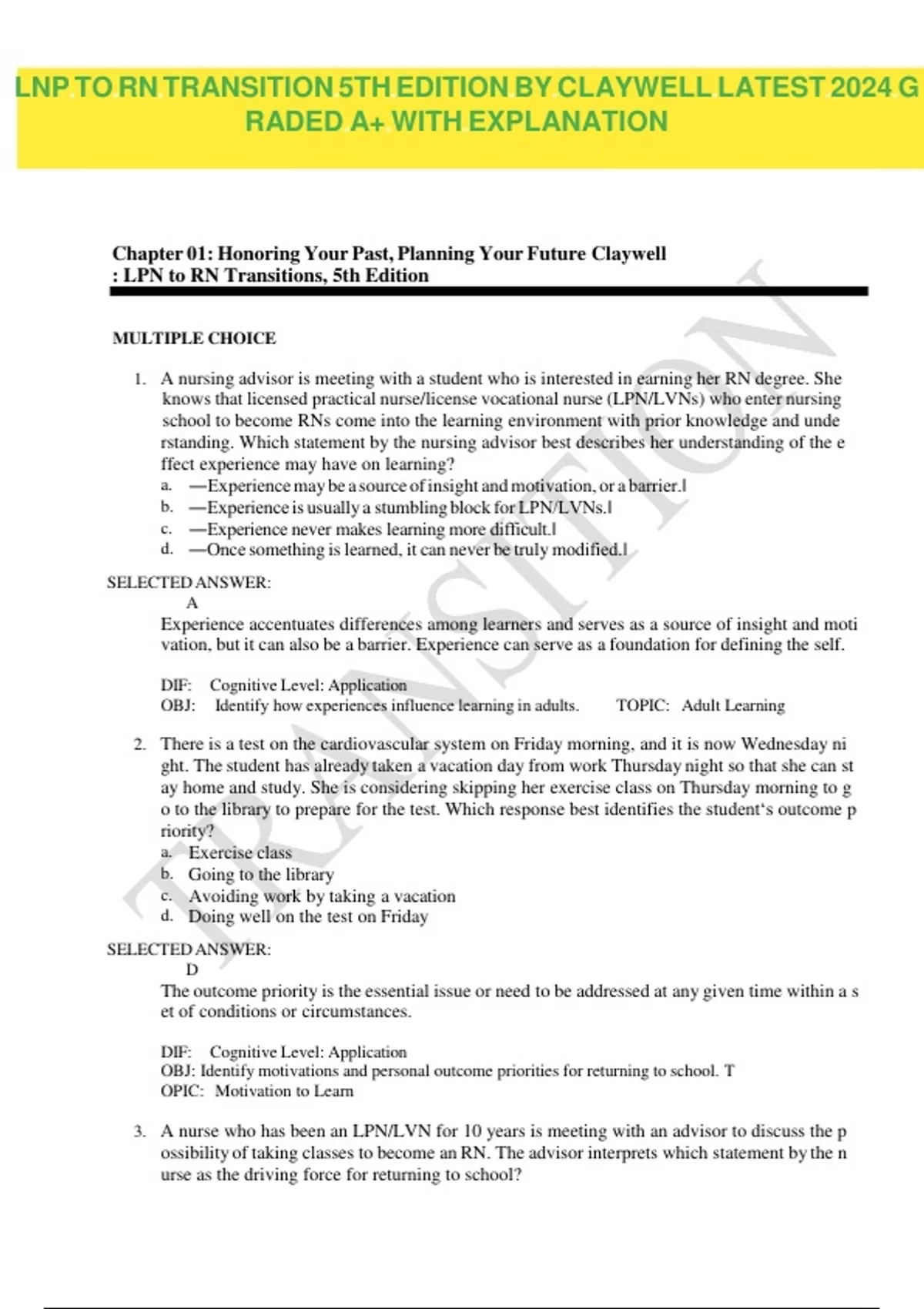 , TEST BANK FOR LPN TO RN TRANSITIONS 5TH EDITION BY CLAYWELL