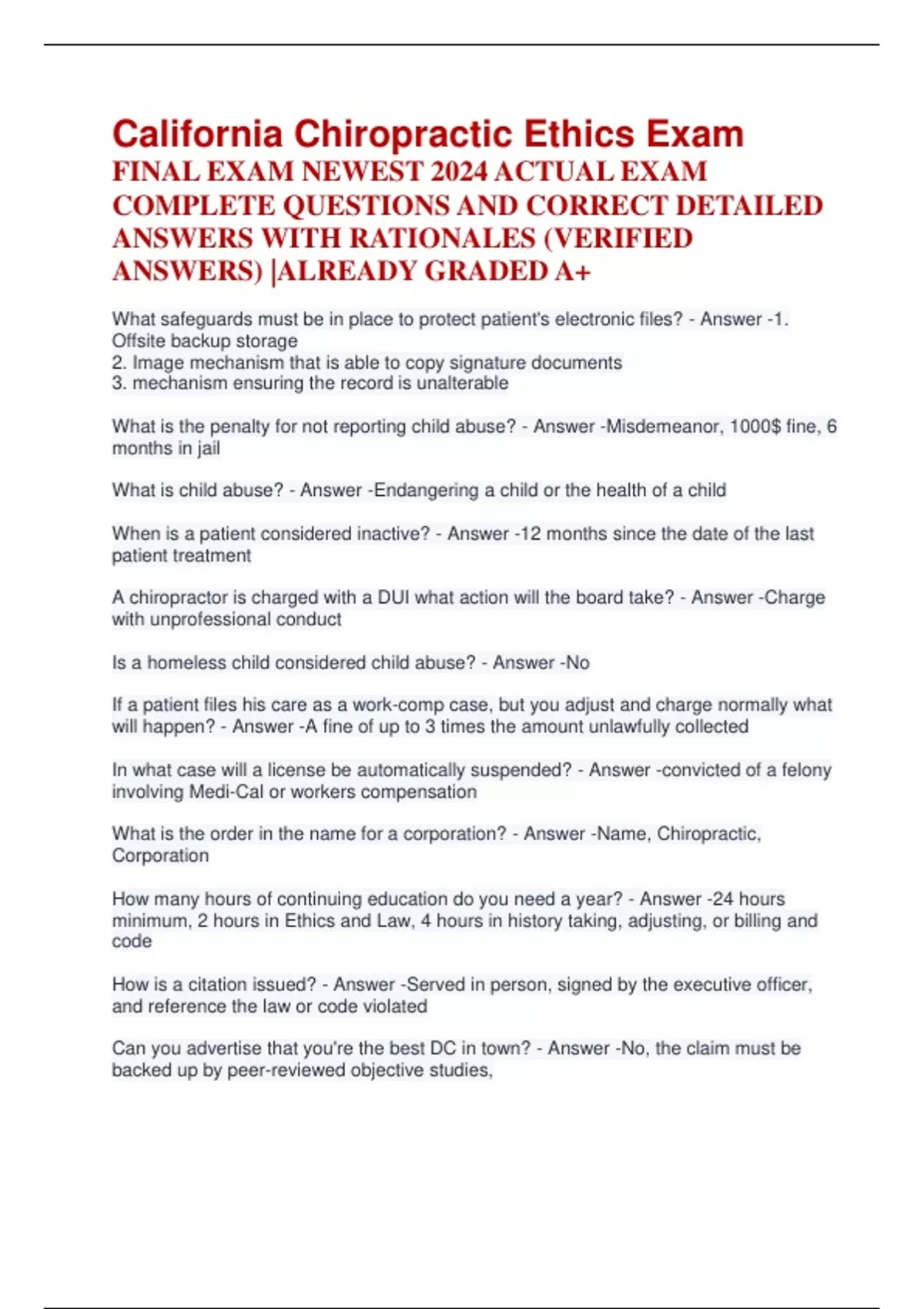 California Chiropractic Ethics Exam FINAL EXAM NEWEST 2024 ACTUAL EXAM COMPLETE QUESTIONS AND CORRECT DETAILED ANSWERS WITH RATIONALES (VERIFIED ANSWERS) |ALREADY GRADED A+ What safeguards must be in place to protect patient's electronic files? - Answer -1. Offsite backup storage 2. Image mechanism that is able to copy signature documents 3. mechanism ensuring the record is unalterable What is the penalty for not reporting child abuse? - Answer -Misdemeanor, 1000$ fine, 6 months in jail What is child abuse? - Answer -Endangering a child or the health of a child When is a patient considered inactive? - Answer -12 months since the date of the last patient treatment A chiropractor is charged with a DUI what action will the board take? - Answer -Charge with unprofessional conduct Is a homeless child considered child abuse? - Answer -No If a patient files his care as a work-comp case, but you adjust and charge normally what will happen? - Answer -A fine of up to 3 times the amount unlawfully collected In what case will a license be automatically suspended? - Answer -convicted of a felony involving Medi-Cal or workers compensation What is the order in the name for a corporation? - Answer -Name, Chiropractic, Corporation How many hours of continuing education do you need a year? - Answer -24 hours minimum, 2 hours in Ethics and Law, 4 hours in history taking, adjusting, or billing and code How is a citation issued? - Answer -Served in person, signed by the executive officer, and reference the law or code violated