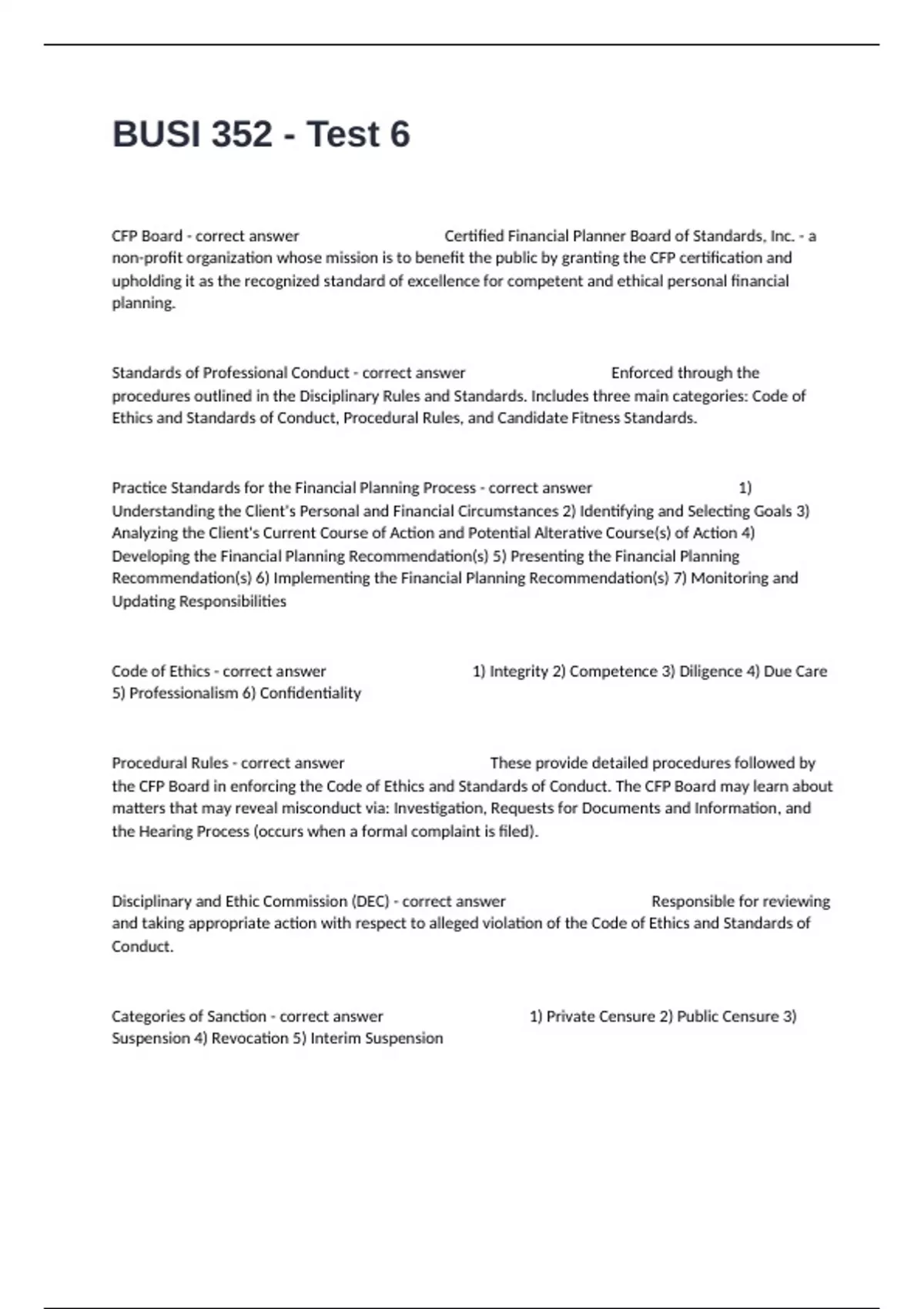 CFP Board - correct answer Certified Financial Planner Board of Standards, Inc. - a non-profit organization whose mission is to benefit the public by granting the CFP certification and upholding it as the recognized standard of excellence for competent and ethical personal financial planning. Standards of Professional Conduct - correct answer Enforced through the procedures outlined in the Disciplinary Rules and Standards. Includes three main categories: Code of Ethics and Standards of Conduct, Procedural Rules, and Candidate Fitness Standards. Practice Standards for the Financial Planning Process - correct answer 1) Understanding the Client's Personal and Financial Circumstances 2) Identifying and Selecting Goals 3) Analyzing the Client's Current Course of Action and Potential Alterative Course(s) of Action 4) Developing the Financial Planning Recommendation(s) 5) Presenting the Financial Planning Recommendation(s) 6) Implementing the Financial Planning Recommendation(s) 7) Monitoring and Updating Responsibilities Code of Ethics - correct answer 1) Integrity 2) Competence 3) Diligence 4) Due Care 5) Professionalism 6) Confidentiality Procedural Rules - correct answer These provide detailed procedures followed by the CFP Board in enforcing the Code of Ethics and Standards of Conduct. The CFP Board may learn about matters that may reveal misconduct via: Investigation, Requests for Documents and Information, and the Hearing Process (occurs when a formal complaint is filed). Disciplinary and Ethic Commission (DEC) - correct answer Responsible for reviewing and taking appropriate action with respect to alleged violation of the Code of Ethics and Standards of Conduct. Categories of Sanction - correct answer 1) Private Censure 2) Public Censure 3) Suspension 4) Revocation 5) Interim Suspension