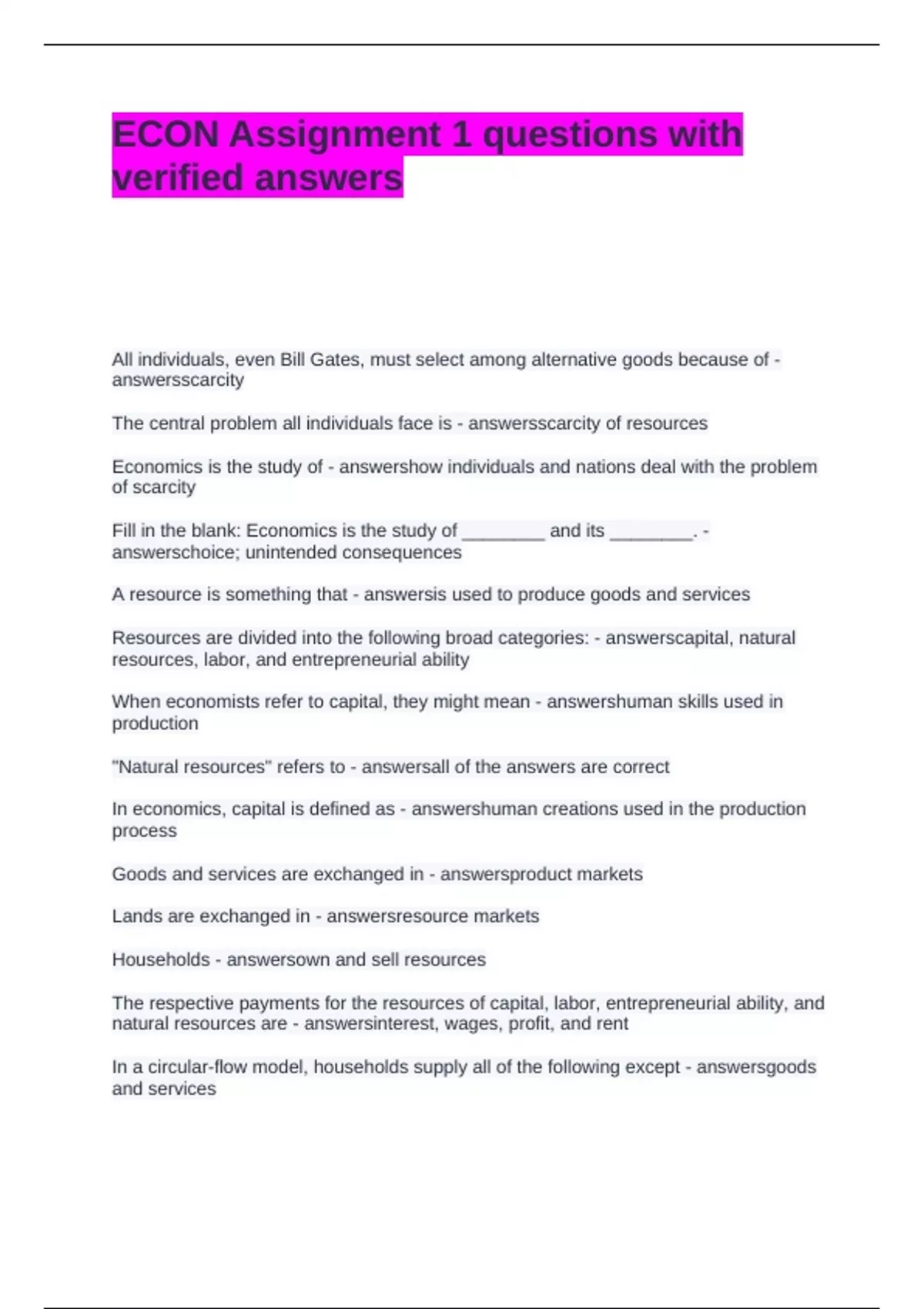 ECON Assignment 1 questions with verified answers All individuals, even Bill Gates, must select among alternative goods because of - answersscarcity The central problem all individuals face is - answersscarcity of resources Economics is the study of - answershow individuals and nations deal with the problem of scarcity Fill in the blank: Economics is the study of ________ and its ________. - answerschoice; unintended consequences A resource is something that - answersis used to produce goods and services Resources are divided into the following broad categories: - answerscapital, natural resources, labor, and entrepreneurial ability When economists refer to capital, they might mean - answershuman skills used in production "Natural resources" refers to - answersall of the answers are correct In economics, capital is defined as - answershuman creations used in the production process Goods and services are exchanged in - answersproduct markets Lands are exchanged in - answersresource markets Households - answersown and sell resources The respective payments for the resources of capital, labor, entrepreneurial ability, and natural resources are - answersinterest, wages, profit, and rent In a circular-flow model, households supply all of the following except - answersgoods and services